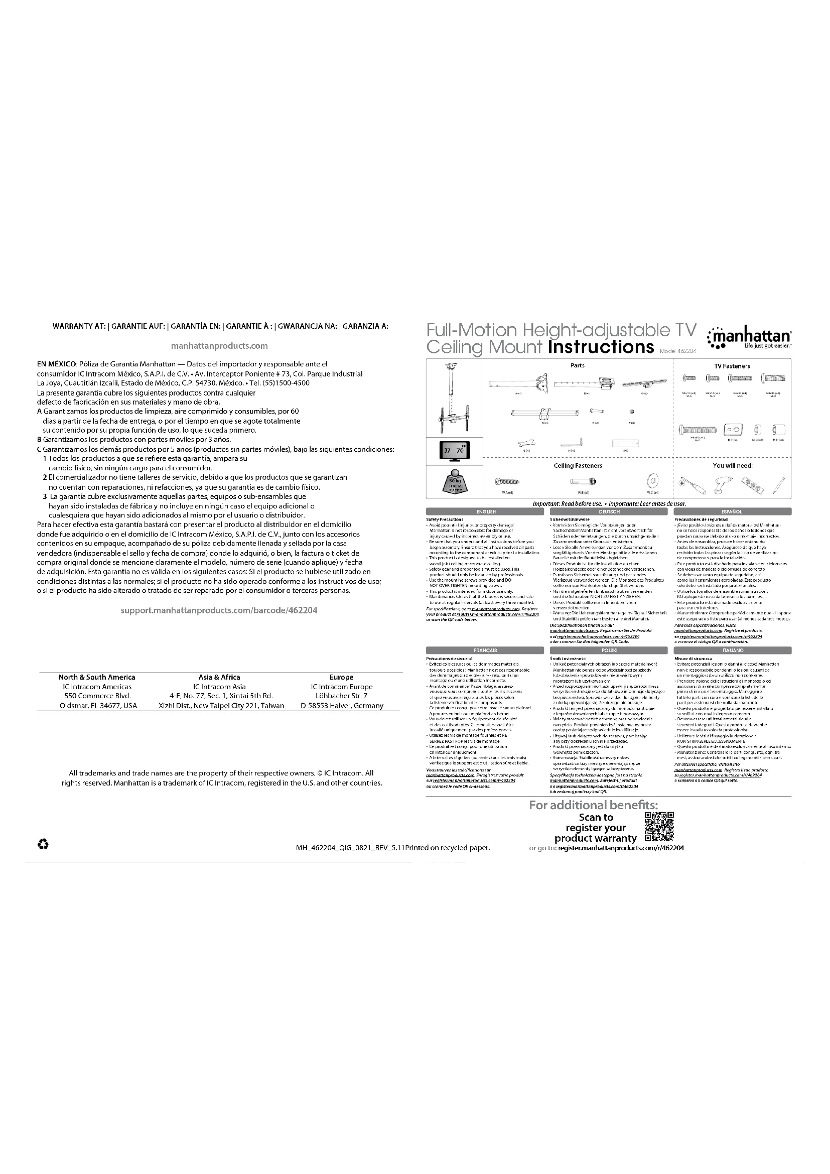 - A intervalles réguliers (au moins tous les trois mois) vérifiez que le support est d’utilisation sûre et fiable. Vous trouvez les spécifications sur manhattanproducts.com. Enregistrez votre produit sur register.manhattanproducts.com/r/462204 ou scannez le code QR ci-dessous. DEUTSCH Sicherheitshinweise