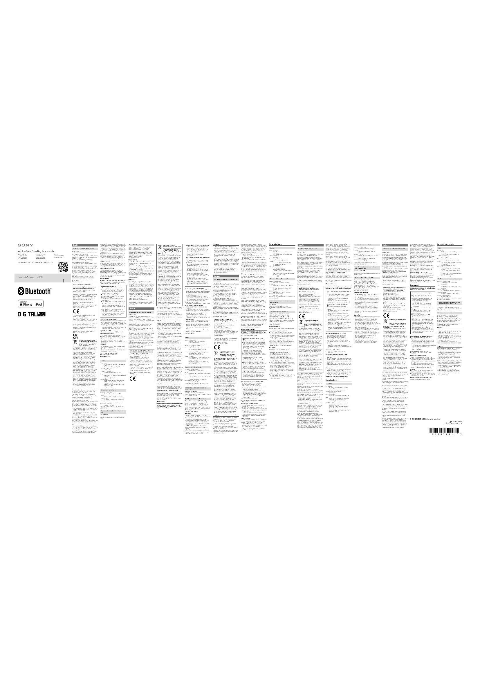 Operating frequency: Bluetooth: 2 400 MHz - 2 483.5 MHz Maximum output power: Bluetooth: < 10 dBm Design and specifications are subject to change without notice. System requirements for battery charge using USB USB AC adaptor A commercially available USB AC adaptor capable of supplying an output current of 0.5 A (500 mA) or more Élimination des piles et accumulateurs et des équipements électriques et électroniques usagés (applicable dans les pays de l’Union Européenne et dans les autres pays disposant de systèmes de collecte sélective) Ce symbole apposé sur le produit, la pile ou l’accumulateur, ou sur l’emballage, indique que le produit et les piles et accumulateurs fournis avec ce produit ne doivent pas être traités comme de simples déchets ménagers. Sur certains types de piles, ce symbole apparaît parfois combiné avec un symbole chimique. Le symbole pour le plomb (Pb) est rajouté lorsque ces piles contiennent plus de 0,004% de plomb. En vous assurant que les produits, piles et accumulateurs sont mis au rebut de façon appropriée, vous participez activement à la prévention des conséquences négatives que leur mauvais traitement pourrait provoquer sur l’environnement et sur la santé humaine. Le recyclage des matériaux contribue par ailleurs à la préservation des ressources naturelles. Pour les produits qui, pour des raisons de sécurité, de performance ou d’intégrité des données, nécessitent une connexion permanente à une pile ou à un accumulateur intégré(e), il conviendra de vous rapprocher d’un service technique qualifié pour effectuer son remplacement. En rapportant votre appareil électrique, les piles et accumulateurs en fin de vie à un point de collecte approprié, vous vous assurez que le produit, la pile ou l’accumulateur intégré sera traité correctement. Pour tous les autres cas de figure et afin d’enlever les piles ou accumulateurs en toute sécurité de votre appareil, reportez-vous au manuel d’utilisation. Rapportez les piles et accumulateurs, et les équipements électriques et électroniques usagés au point de collecte approprié pour le recyclage. Pour toute information complémentaire au sujet du recyclage de ce produit ou des piles et accumulateurs, vous pouvez contacter votre municipalité, votre déchetterie locale ou le point de vente où vous avez acheté ce produit. Cet appareil a été testé et déclaré comme conforme aux limites de la norme EMC en utilisant un câble de connexion de moins de 3 m. Un volume élevé peut nuire à votre audition. N’utilisez pas l’appareil lorsque vous marchez, conduisez ou faites du vélo. Cela pourrait provoquer des accidents de la circulation. N’utilisez pas l’appareil dans des zones dangereuses à moins que les bruits environnants puissent être entendus. Si de l’eau ou des corps étrangers pénètrent dans l’appareil, cela pourrait provoquer un incendie ou un choc électrique. Si de l’eau ou un corps étranger pénètre dans l’appareil, cessez immédiatement de l’utiliser, puis consultez votre revendeur Sony le plus proche. En particulier, faites attention dans les cas suivants :