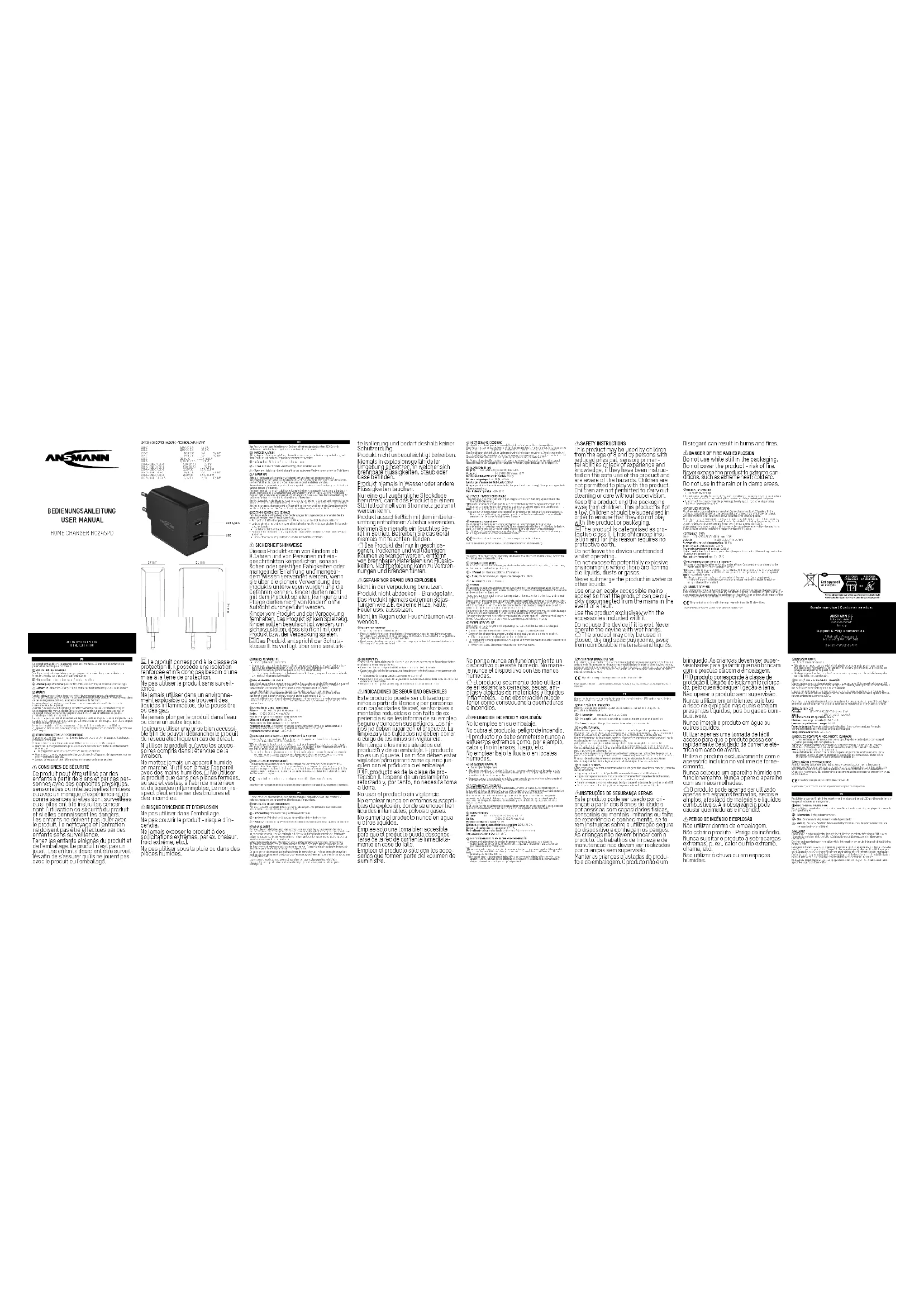 Ce produit peut être utilisé par des enfants à partir de 8 ans et par des per- sonnes avec des capacités physiques, sensorielles ou intellectuelles limitées ou avec un manque d’expérience et de connaissances si elles sont surveillées ou si elles ont été instruites concer- nant l’utilisation de sécurité du produit et si elles connaissent les dangers. Les enfants ne doivent pas jouer avec le produit. Le nettoyage et l’entretien ne doivent pas être effectués par des enfants sans surveillance. Tenez les enfants éloignés du produit et de l‘emballage. Le produit n‘est pas un jouet. Les enfants devraient être surveil- lés afin de s‘assurer qu‘ils ne jouent pas avec le produit ou l’emballage. REMARQUES GÉNÉRALES Ne pas jeter ou laisser tomber Ne pas ouvrir ou modifier le produit ! Les travaux de réparation ne doivent être effec- tués que par le fabricant ou par un technicien de service chargé de ce travail par le fabricant ou par une personne qualifiée de manière similaire ! Pour la coupure de l’appareil de l’alimentation électrique, toujours tirer sur la fiche du connecteur et jamais sur le câble. MISE EN SERVICE | UTILISATION Branchez l’appareil sur une prise appropriée. Raccordez un câble USB compatible au port USB correspondant sur l’appareil. Avant le raccordement d‘un appareil, vérifiez si les caractéristiques techniques indiquées suffisent pour vos utilisations.L‘appareil peut devenir très chaud à plein régime de charge. Ceci est normal et sans danger. Pour éviter un échauffement excessif, ne couvrez pas l‘appareil et ne le faites pas fonctionner à des températures ambiantes supérieures à 25°C.Lors de l‘utilisation du bloc d’alimentation pour l’alimentation d‘un ordinateur portable, veuillez à ce que la puissance de sortie maximale corresponde aux exigences de l’ordinateur. CARACTÉRISTIQUES TECHNIQUESEntrée : 110 - 240 V AC | 50-60 Hz | max. 1.0 ASortie : 5-20 V DC | 3.0 A | max. 45 WEfficacité moyenne en fonctionnement : 80.9 %Efficacité à charge faible (10 %) : 73.5 %Puissance absorbée à charge nulle : 0.290 WProtection de sortie : Protection contre les courts-circuits | Contrôle de la température | Protection contre les surtensions | Protection contre les surintensitésTempérature extérieure max : -20 - 35 °C REMARQUE CONCERNANT L’ENVIRONNEMENT | ÉLIMINATION Éliminez l’emballage par type. Mettez le papier et le papier avec les déchets de papier et le film avec les matières recyclables. Éliminez le produit inutilisable conformément aux dispositions légales. Le marquage avec la « poubelle » indique que dans l’UE, les appareils électriques ne doivent pas être éliminés avec les déchets domestiques normaux. Transmettez le produit à un point de collecte spécial pour appareils usagés en vue de son élimination, utilisez les systèmes de reprise et de collecte de votre commune ou adressez-vous au revendeur auprès de qui l’appareil a été acheté. EXCLUSIONS DE RESPONSABILITÉLes informations fournies dans ce mode d‘emploi peuvent être modifiées sans notifica-tion préalable. Nous n‘endossons aucune responsabilité pour les dommages ou dom-mages conséquents directs, indirects, accidentels ou autre causés par la manipulation inappropriée / l’utilisation incorrecte ou par le non-respect des informations fournies dans ce mode d‘emploi.Le produit est conforme aux exigences des directives européennes.Sous réserve de modifications techniques. Nous n‘endossons aucune responsabilité pour les erreurs d‘impression. El producto tiene el cometido de suministrar energía a dispositivos con una interfaz USB estandarizada en los parámetros técnicos aquí expuestos. EXPLICACIÓN DE LAS INDICACIONESPor favor, observe las siguientes señales y palabras que se emplearán en las instruccio-nes de servicio, en el producto y en el envase: = Información | Informaciones prácticas adicionales = Indicación | Esta indicación avisa de posibles daños de todo tipo = Aviso | ¡Atención, peligro!! Puede tener como consecuencia heridas graves o la muerte GENERALIDADESPor favor, desembale todas las piezas y compruebe su integridad y que no estén dañadas. En caso de darse daños no ponga en funcionamiento el producto. Póngase en contacto con un comercio especializado autorizado o diríjase a la dirección de servicio del fabricanteEstas instrucciones de servicio contienen importantes informaciones para el empleo y la puesta en servicio de este producto.Antes de la puesta en servicio del producto lea íntegramente y a fondo las instrucciones de servicio. Lea igualmente las instrucciones de servicio de otros dispositivos que hayan de funcionar con este producto o se conecten a él. Guarde las instrucciones de servicio para usos posteriores o para el siguiente propietario.En caso de no observarse las instrucciones de servicio y las indicaciones de seguridad podrían darse daños en el producto y correrse peligros (heridas) que afectarían al usuario y otras personas.Las instrucciones de servicio son relativas a las normas y reglas vigentes en la Unión Europea. A este respecto sírvase observar las leyes y directivas específicas de los países extranjeros. USO PRESCRITOA menos que el manual de uso del dispositivo que desea cargar especifique algo distinto, siga las siguientes instrucciones: Conecte el terminal al puerto USB mediante un cable USB adecuado Conecte el dispositivo de carga a una toma de corriente instalada correctamente y de fácil acceso El progreso de la carga puede observarse en el terminal Para interrumpir el proceso de carga, desconecte el dispositivo de la toma de corriente o desconecte el cable Desconecte el dispositivo de carga de la red si no está siendo utilizado