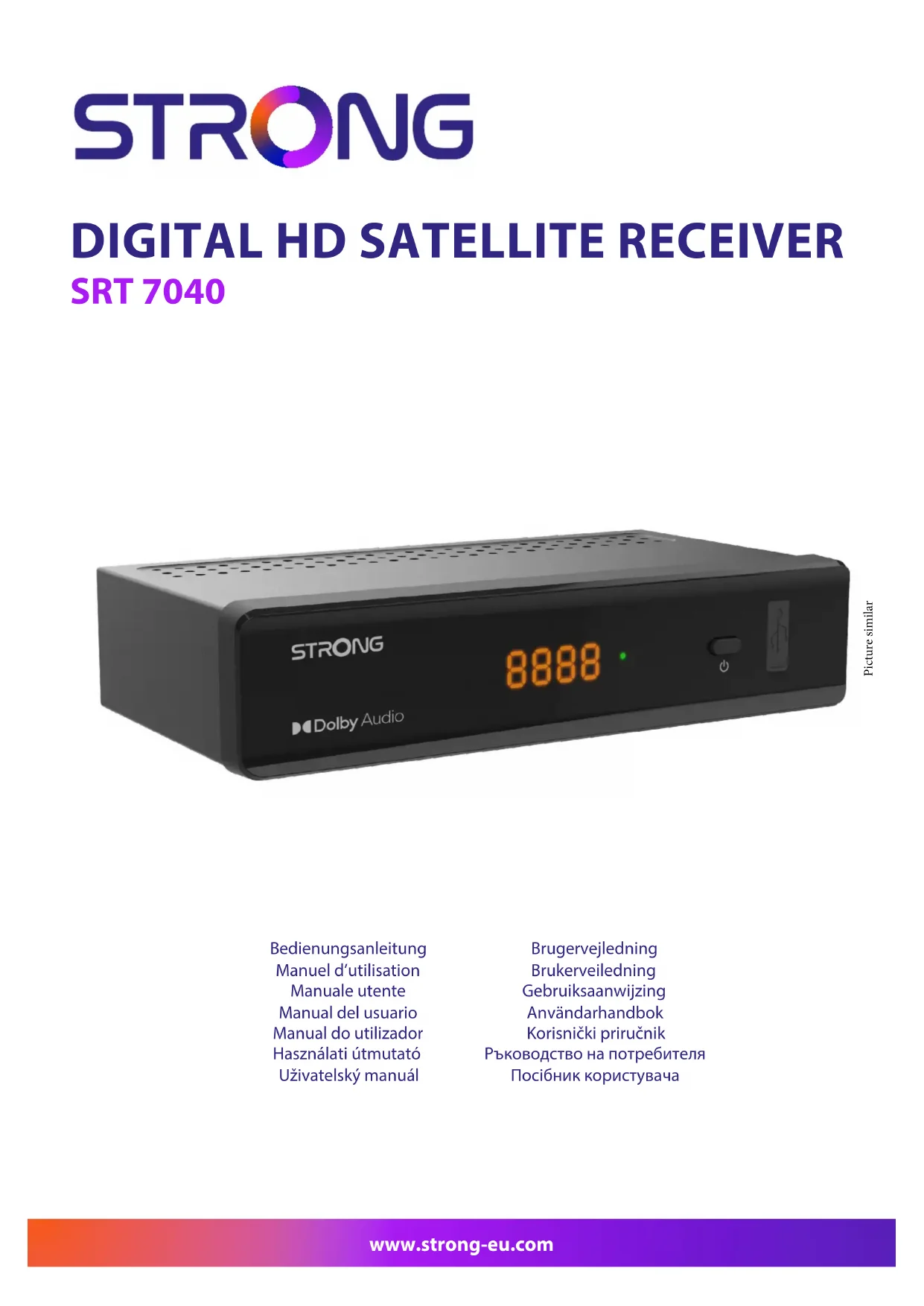 SRT 7040 Picture similar Bedienungsanleitung Manuel d’utilisation Manuale utente Manual del usuario Manual do utilizador Használati útmutató Uživatelský manuál Brugervejledning Brukerveiledning Gebruiksaanwijzing Användarhandbok Korisnički priručnik Ръководство на потребителя Посібник користувача www.strong-eu.comwww.strong-eu.com Supplied by STRONG Austria Represented by STRONG Ges.m.b.H. Teinfaltstraße 8/4. Stock 1010 Vienna, Austria Email: support_at@strong-eu.com 26 Sep 2023 09:481 Licenses Ce produit contient un ou plusieurs programmes protégés par les lois internationales et américaines sur les droits d'auteur des oeuvres non publiées. Elles sont condentielles et la propriété de Dolby Laboratories. Leur reproduction ou divulgation, en tout ou en partie, ou la production d'œuvres dérivées sans la permission expresse de Dolby Laboratories est interdite. Droit d'auteur 2003- 2009 par Dolby Laboratories. Tous droits réservés.