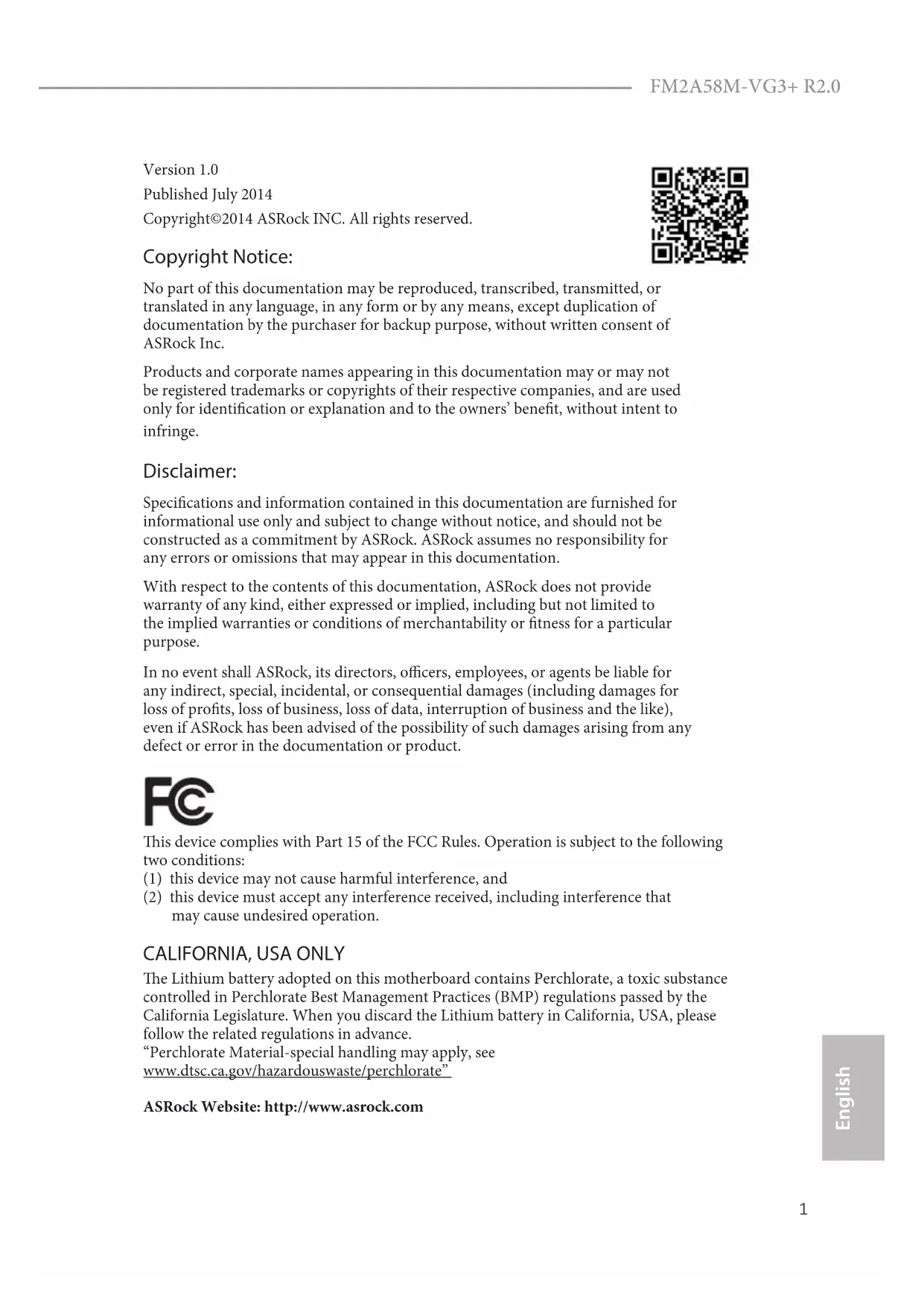 Retrouvez gratuitement la notice de l'appareil FM2A58M-VG3+ R2.0 ASROCK au format PDF.