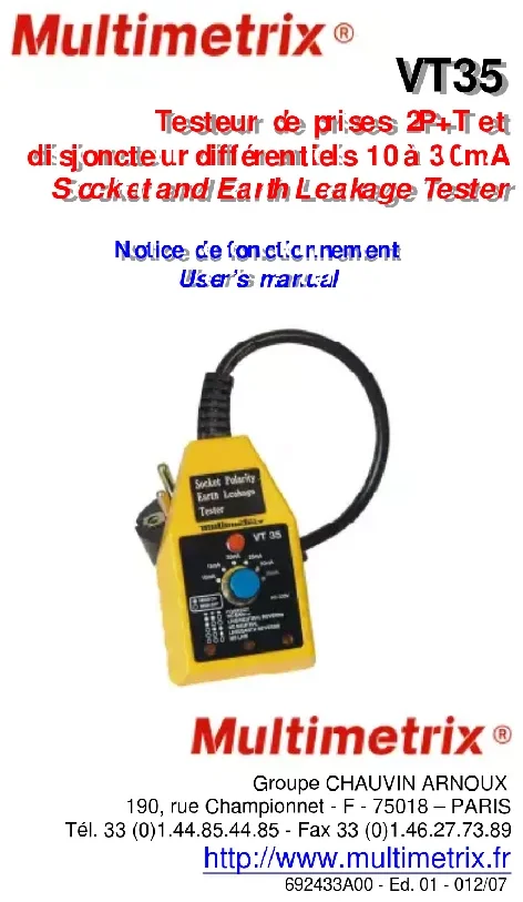 Précautions et Mesures de sécurité Vous venez d'acquérir un testeur VT35 et nous vous remercions de votre confiance. Le VT35 permet le contrôle des prises 2P+T en régime TT et la détection d’anomalie de 1