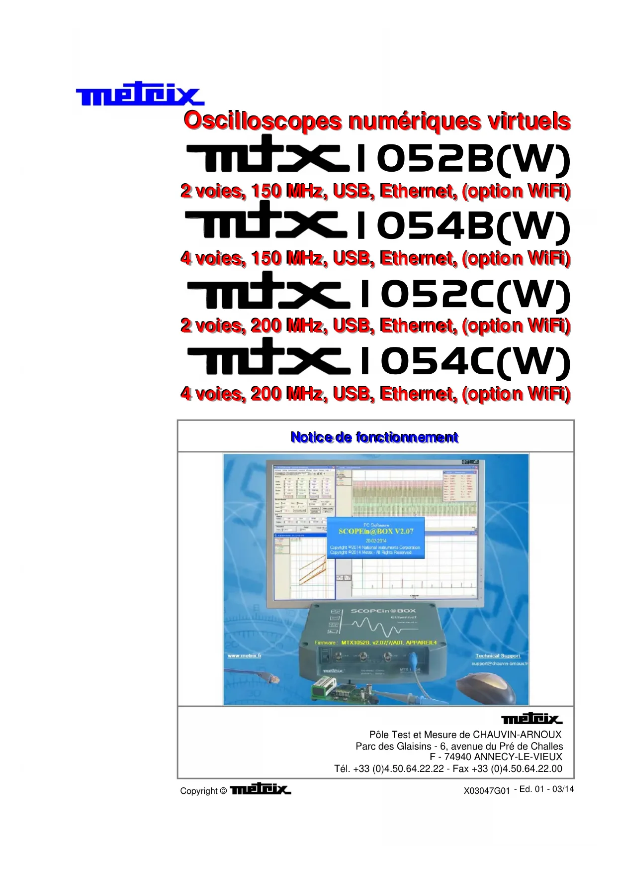- Laissez sécher avant toute nouvelle utilisation.Description de l’instrument Oscilloscopes numériques virtuels II - 7 Description de l’instrument Cette notice décrit le fonctionnement des MTX 1052 et MTX 1054. La plupart des copies d’écran ont été réalisées à partir d’un MTX 1054B. Préparation à l’utilisation Consignes avant la mise en service