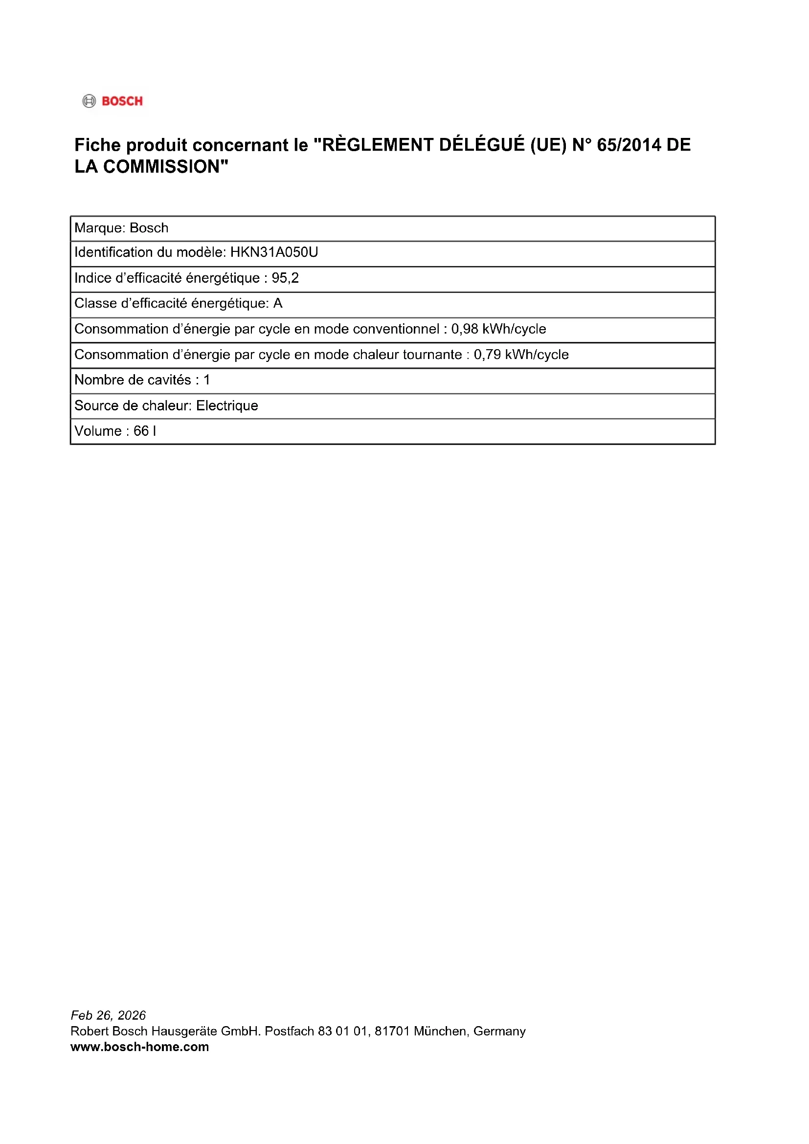 Fiche produit concernant le "RÈGLEMENT DÉLÉGUÉ (UE) N° 65/2014 DE LA COMMISSION" Marque: Bosch Identification du modèle: HKN31A050U Indice d’efficacité énergétique : 95,2 Classe d’efficacité énergétique: A Consommation d’énergie par cycle en mode conventionnel : 0,98 kWh/cycle Consommation d’énergie par cycle en mode chaleur tournante : 0,79 kWh/cycle Nombre de cavités : 1 Source de chaleur: Electrique Volume : 66 l Feb 26, 2026 Robert Bosch Hausgeräte GmbH. Postfach 83 01 01, 81701 München, Germany www.bosch-home.comInformations sur le produit relatives au "RÈGLEMENT (UE) N° 66/2014 DE LA COMMISSION" Nombre de zones et/ou aires de cuisson: 4 Consommation d’énergie de la plaque de cuisson, calculée par kg: 191,3 Wh/kg Wh/kg A B C D E F Technologie de chauffage (zones et aires de cuisson par induction, zones de cuisson conventionnelle, plaques électriques) Chauff. par rayon. thermique Chauff. par rayon. thermique Chauff. par rayon. thermique Chauff. par rayon. thermique Dimension: Pour les zones ou aires de cuisson circulaires: diamètre de la surface utile par zone de cuisson électrique, arrondi aux 5 mm les plus proches (cm) 14,5 18,0 14,5 21,0 Consommation d’énergie par zone ou aire de cuisson calculée par kg (Wh/ kg) 191,3 189,7 191,3 193,1 Informations selon EN 60350-2 (Électro) / EN 30-2-1 (Gas) Feb 26, 2026 Robert Bosch Hausgeräte GmbH. Postfach 83 01 01, 81701 München, Germany www.bosch-home.com