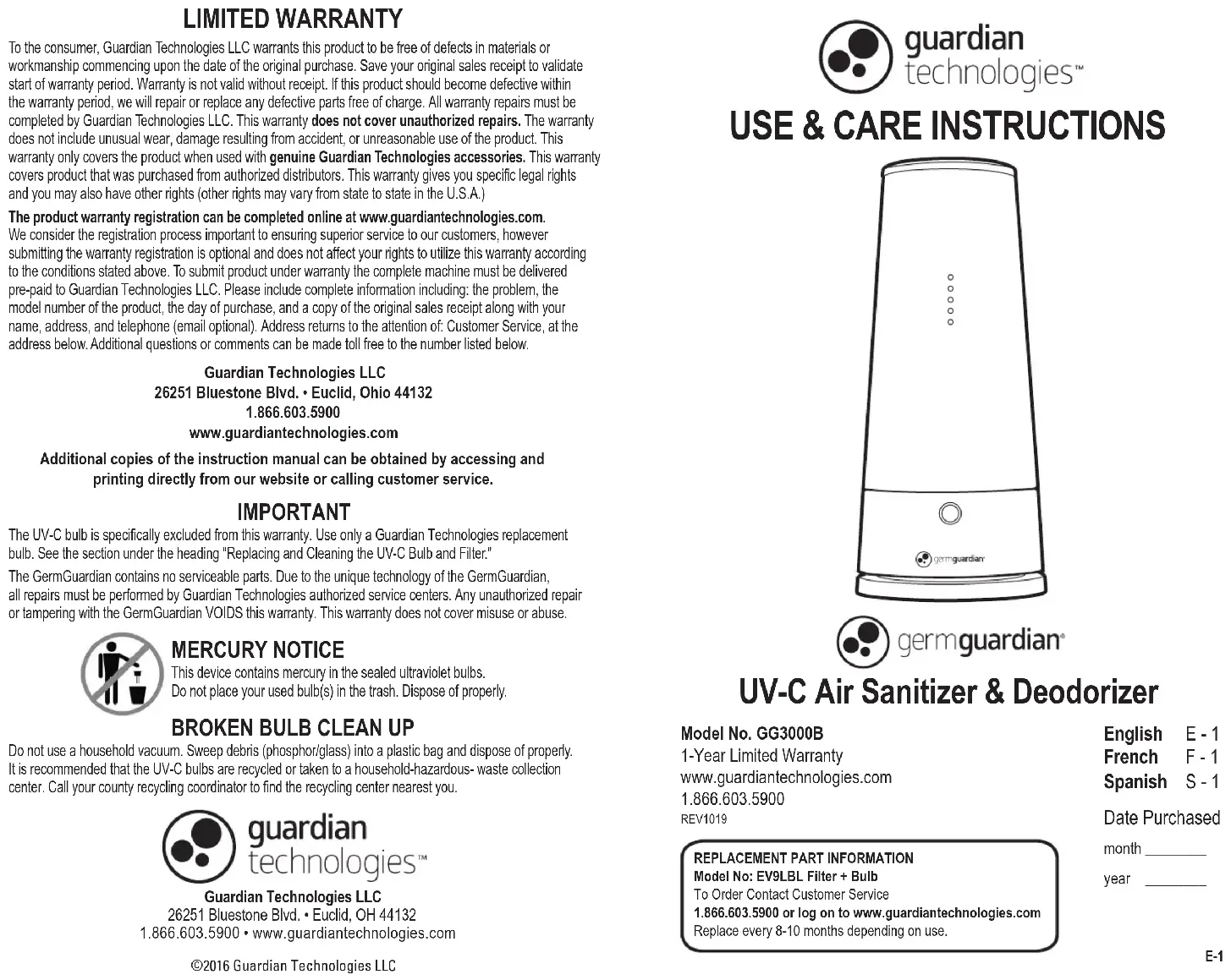 UNE MAUVAISE INSTALLATION OU UNE MAUVAISE UTILISA TION DE L'AMPOULE UVC PEUT CAUSER DES BLESSURES AUX YEUX OU À LA PEAU. NE JAMAIS UTILISER L'AMPOULE SANS L'AVOIR INSTALLÉE DANS L'APP AREIL EN SUIVANT LES INSTRUCTIONS. NE JAMAIS FAIRE FONCTIONNER L'APPAREIL SANS LE CAPUCHON EN PLACE. Le seul entretien possible sur cet appareil est le remplacement de l'ampoule UVC. L'ampoule ne contient aucune pièce de rechange. Toutes les pieces, à l'exception de l'ampoule UVC, sont garanties 1 ans à partir de la date d'achat. Voir la garantie limitée. L'utilisation d'une ampoule autre que l'ampoule appropriée GermGuardian annule la garantie. Vous pouvez acheter les ampoules directement de Guardian Technologies LLC, ou nous pouvons vous fournir les noms des détaillants qui vendent nos produits.Les aspects médicaux associés à cet appareil et sa capacité de contribuer à la désinfection de l'air environnant n'ont pas été vérifiés par UL. L'achat d'un GermGuardian ne prévient pas la maladie. GermGuardian est conçu pour cibler et détruire 99,9% des germes en suspension dans l'air. GermGuardian est une marque enregistrée de Guardian Technologies LLC.S-1 Desinfectante de Aire y Desodorizante UV-C Inglés E - 1 Francés F - 1 Español S - 1 Fecha de compra mes ________año ________