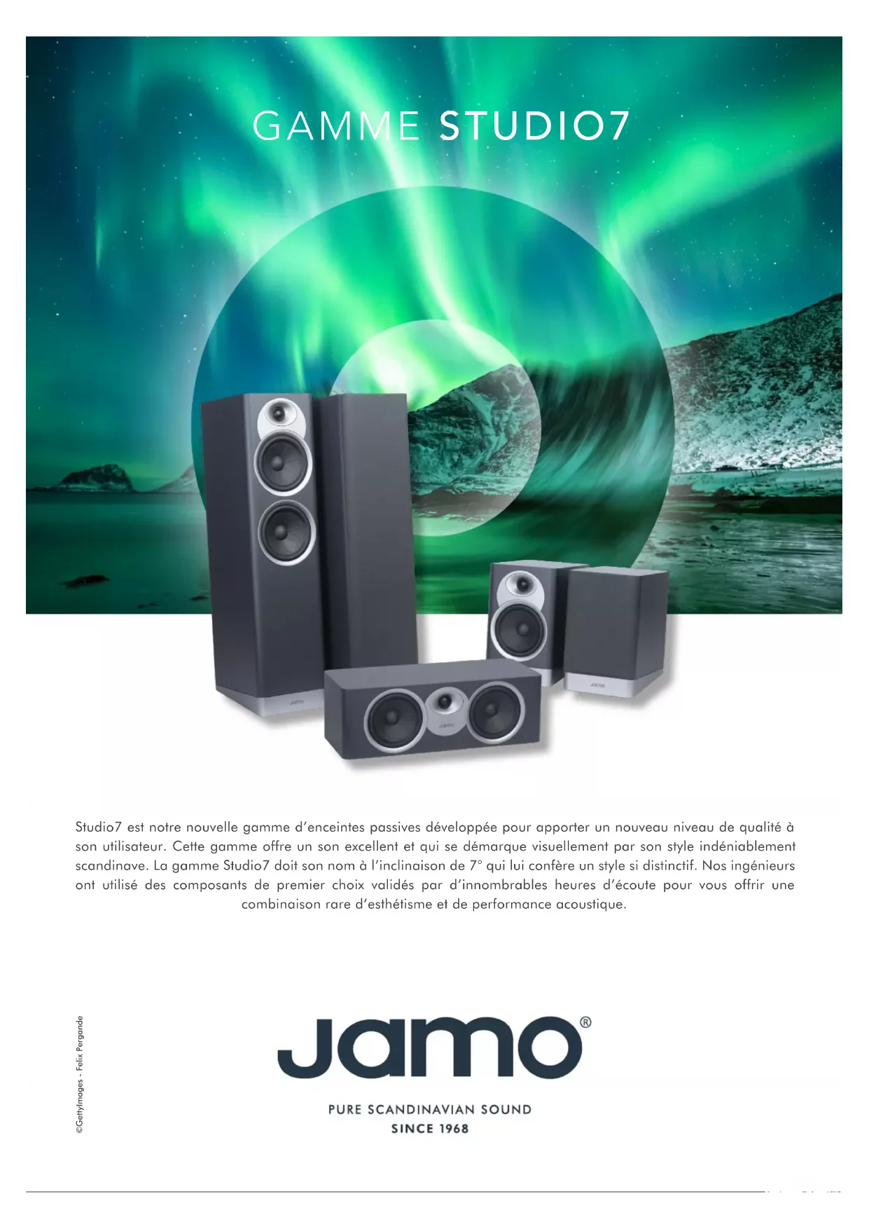Studio7 est notre nouvelle gamme d’enceintes passives développée pour apporter un nouveau niveau de qualité à son utilisateur. Cette gamme offre un son excellent et qui se démarque visuellement par son style indéniablement scandinave. La gamme Studio7 doit son nom à l’inclinaison de 7° qui lui confère un style si distinctif. Nos ingénieurs ont utilisé des composants de premier choix validés par d’innombrables heures d’écoute pour vous offrir une combinaison rare d’esthétisme et de performance acoustique. GAMME STUDIO7 ©GettyImages - Felix PergandeDESIGN EUROPÉEN ET RACINES SCANDINAVES Avec son esthétique minimaliste, ses lignes épurées et son souci du détail, la gamme Studio7 est un excellent exemple de design scandinave : la forme du produit répond à une fonction et ouvre une nouvelle ère de performance pour Jamo. Débordante d’innovations techniques, notre équipe de conception a créé une enceinte intemporelle qui embellira votre intérieur. Inspirée par la nature scandinave, la gamme Studio7 est un hommage à nos deux fondateurs, Preben Jacobsen et Julius Mortensen.
