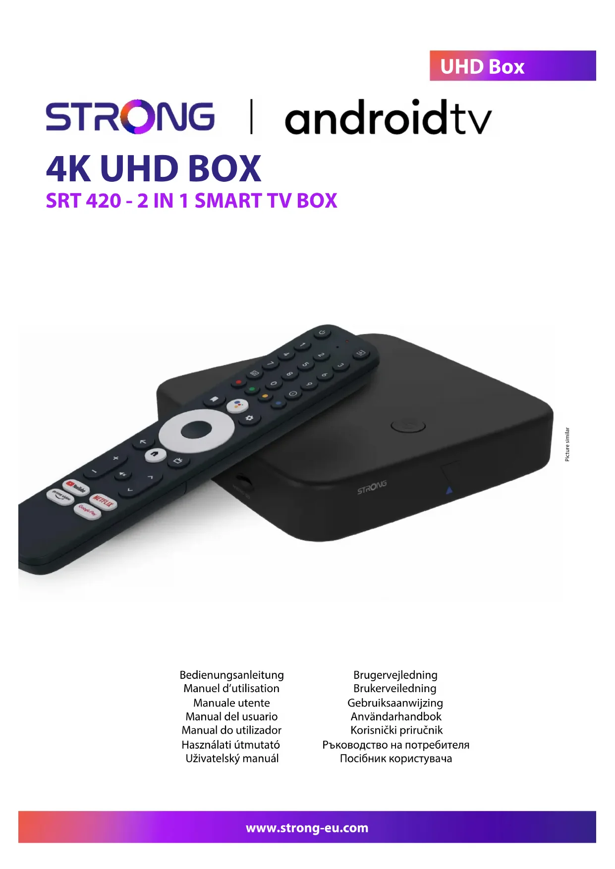 SRT 420 - 2 IN 1 SMART TV BOX28 Jan 2025 10:04 www.strong-eu.com Supplied by STRONG Austria Represented by STRONG Ges.m.b.H. Teinfaltstraße 8/4.Stock A-1010 Vienna, Austria Email: support_at@strong.-eu.com1 LICENSES This product contains one or more programs protected under international and U.S. copyright laws as unpublished works. They are condential and proprietary to Dolby Laboratories. Their reproduction or disclosure, in whole or in part, or the production of derivative works therefrom without the express permission of Dolby Laboratories is prohibited. Copyright 2003-2009 by Dolby Laboratories. All rights reserved. DÉCLARATION DE CONFORMITÉ UE SIMPLIFIÉE STRONG déclare que l'appareil SRT 420 est conforme à la directive 2014/53 / UE. Le texte complet de la déclaration de conformité UE est disponible à l'adresse Internet suivante: https://www.strong-eu.com/ downloads/downloads Sous réserve de modications. En raison de la recherche et du développement continus, les spécications techniques, la conception et l'apparence des produits peuvent changer. Google, Google Play, YouTube, Android TV et d'autres marques sont des marques déposées de Google LLC. Wi-Fi, WPA2, WPA sont des marques déposées de Wi-Fi Alliance®. Skype est une marque enregistrée de Skype et STRONG n'est pas alié, parrainé, autorisé ou autrement associé par / avec le groupe de sociétés Skype. Les termes HDMI, HDMI High-Denition Multimedia Interface, l’habillage commercial HDMI et les logos HDMI sont des marques commerciales ou des marques déposées de HDMI Licensing Administrator, Inc. Fabriqué sous licence de Dolby Laboratories. Dolby, Dolby Audio et le symbole du double D sont des marques déposées de Dolby Laboratories Licensing Corporation. Tous les autres noms de produits sont des marques commerciales ou des marques déposées de leurs propriétaires respectifs. © STRONG 2025. Tous droits réservés.2