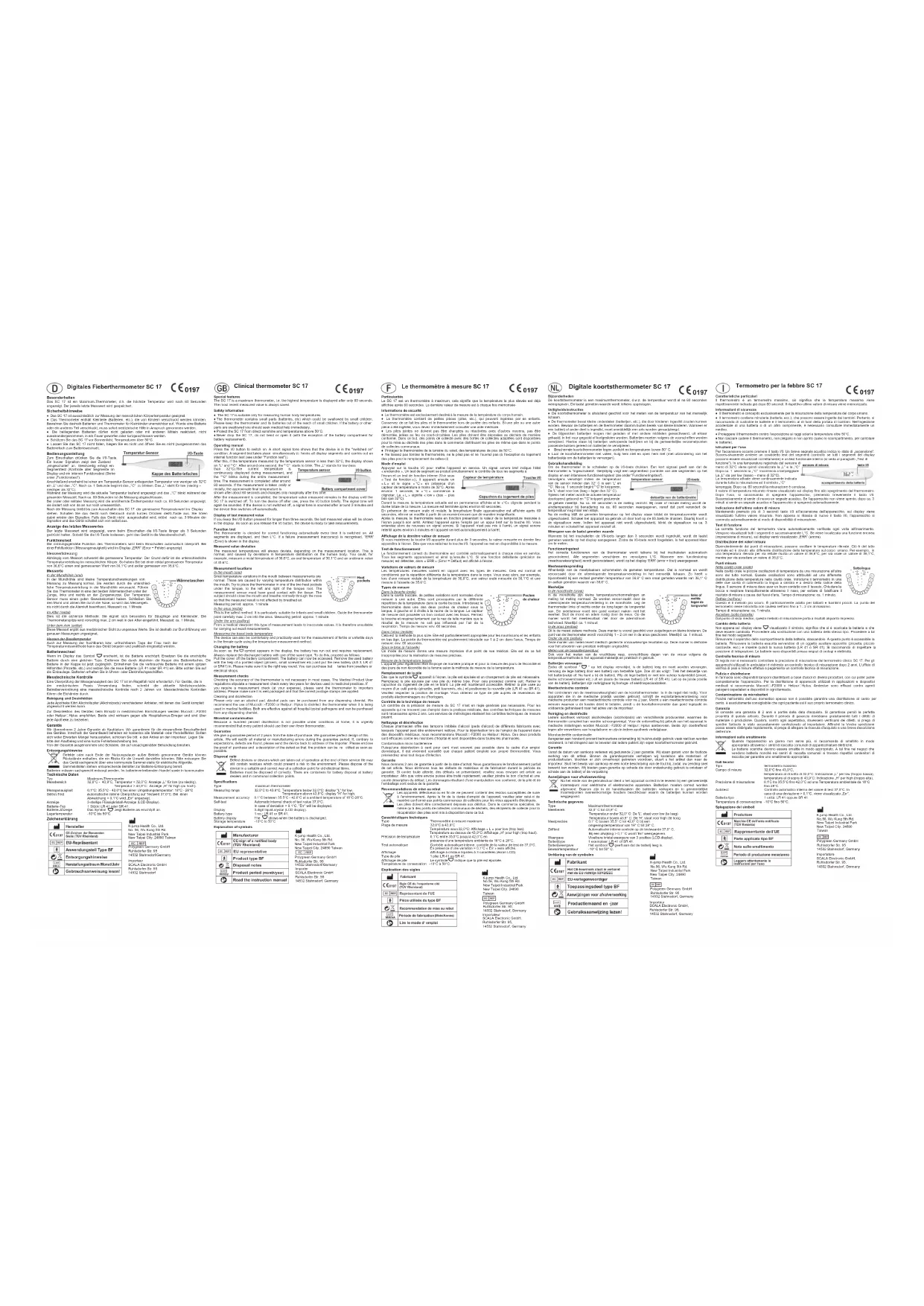 enclenché ». Un test de segment se produit simultanément le contrôle de tous les segments à l’écran et un test de fonction interne (Voir sous « Test de fonction »)). Il apparaît ensuite un « L » et le signe « °C » en présence d’un capteur de température à moins de 32°C. Après environ 1 seconde, le « °C » commence à clignoter. Le « L » signifie « low » (bas – plus bas que 32°C). Durant la mesure, la température actuelle est en permanence affichée et le «°C» clignote pendant la durée totale de la mesure. La mesure est terminée après environ 60 secondes. En présence de mesure orale et rectale, la température finale approximative est affichée après 60 secondes, elle ne se modifie à partir de ce moment encore que de manière insignifiante. Après la mesure, le thermomètre reste en fonction présentant la valeur de la température mesurée à l’écran jusqu’à son arrêt. Arrêtez l’appareil après l’emplo i par un appui bref sur la touche I/0. Vous entendez alors de nouveau un signal sonore. Si l’appareil n’est pas mis à l’arrêt, un signal sonore retentit après environ 3 minutes et l’appareil se met automatiquement à l’arrêt. Affichage de la dernière valeur de mesure Si vous maintenez la touche I/0 appuyée durant plus de 3 secondes, la valeur mesurée en dernier lieu apparaîtra à l’écran. Dès que vous relâchez la touche I/0, l’appareil se met en disponibilité à la mesure. Test de fonctionnement Le fonctionnement correct du thermomètre est contrôlé automatiquement à chaque mise en service. Tous les segments apparaissent et ainsi qu’ensuite L°C. Si une fonction défaillante (précision de mesure) est détectée, alors « ERR » (Error = Défaut) est affiché à l’écran. Variations de valeurs de mesure Les températures mesurées varient en rapport avec les types de mesures. Cela est normal et conditionné par la répartition différente de la te mpérature dans le corps. Vous avez alors, par exemple, lors d’une mesure rectale de la température de 36,6°C, une valeur orale mesurée de 36,1°C et une mesure à l’aisselle de 35,6°C. Types de mesure Dans la bouche (orale) Dans la cavité buccale, de petites variations sont normales d’une mesure à une autre. Elles sont provoquées par la différente répartition de la température dans la cavité buccale. Introduisez le thermomètre dans une des deux poches de chaleur sous la langue, à gauche et à droite à la racine de la langue. Le capteur de mesure doit posséder un bon contact avec les tissus. Fermez la bouche et respirez lentement par le nez de telle manière que le résultat de la mes ure ne soit pas influencé par l’air de la respiration. Temps de mesure: env. 60 secondes. Dans l’anus (rectale) Cela est la méthode la plus sûre. Elle est particulièrement appropriée pour les nourrissons et les enfants en bas âge. La pointe du thermomètre est prudemment introduite sur 1 à 2 cm dans l’anus. Temps de mesure: env. 60 secondes. Sous le bras (à l’aisselle) Ce mode de mesure donne une mesure imprécise d’un point de vue médical. Elle est de ce fait inappropriée pour la réalisation de mesures précises. Mesure de la température basale L’appareil peut également être employé de manière pratique et pour la mesure des jours de fécondité et des jours de non fécondité de la femme selon la méthode de mesure de la température. Remplacement de la pile Dès que le symbole apparaît à l’écran, la pile est épuisée et un changement de pile est nécessaire. Remplacez la pile épuisée par une pile du même type. Pour cela procédez comme suit: Retirer le capuchon du logement de pile en le tirant. La pile est maintenant accessible. Retirez la pile usée au moyen d’un outil pointu (pincette, petit tournevis, etc.) et positionnez la nouvelle pile (LR 41 ou SR 41). Veuillez respecter la position de montage. Vous obtenez ce type de pile auprès de r evendeurs de produits électroménagers ou d’horlogers. Contrôle de la technique de mesure Un contrôle de la précision de mesure du SC 17 n’est en règle générale pas nécessaire. Pour les appareils qui ne trouvent pas d’emploi dans la pratique médicale, des contrôles techniques de mesures sont nécessaires après 2 ans. Les services de métrologies réalisent les contrôles techniques de mesure payant. Nettoyage et désinfection Chaque pharmacien offre des tampons imbi bés d’alcool (pads d’alcool) de différents fabricants avec lesquels l’appareil peut être entièrement nettoyé. Pour la désinfection lors de l’emploi de l’appareil dans des dispositifs médicaux, nous recommandons Mucocit-F2000 ou HelipurHplus. Ces deux produits sont efficaces contre les microbes d’hôpital et sont disponibles dans toutes les pharmacies. Contamination micro bactérienne Puisqu’une désinfection à cent pour cent n’est souvent pas possible dans le cadre d’un emploi domestique, il est vivement conseillé que chaque patient emploie son propre thermomètre. Vous préviendrez ainsi tout risque d'infection. Garantie Nous donnons 2 ans de garantie à partir de la date d’achat. Nous garantissons le fonctionnement parfait de cet article. Nous éliminons tous les défauts de matériaux et de fabrication durant la période de garantie. Si contre toute attente, des défauts se présentaient, veuillez nous envoyer cet article au impor tateur. Afin que votre envoie puisse être traité rapidement, veuillez joindre le bon d’achat et une courte description du défaut. Les dommages résultant d’une manipulation non conforme, de la pile et de l’emballage sont exclus de la garantie. Recommandations de mise au rebut Les appareils défectueux ou en fin de vie peuvent contenir des résidus susceptibles de nuire à l'environnement. Après la fin de la durée d’emploi de l’appareil, veuillez jeter celui-ci de manière conf orme aux points communaux de collectes pour les vieux 