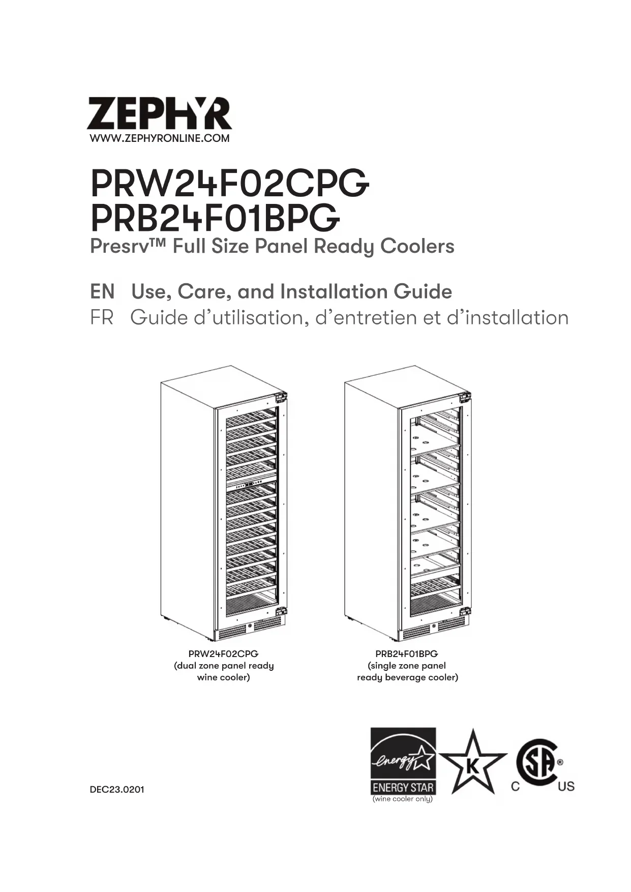 Nettoyage extérieur La porte et l’armoire peuvent être nettoyées avec un détergent doux et une solution d’eau tiède comme deux (2) cuillères à soupe de bicarbonate de soude pour un (1) litre d’eau. N’utilisez pas de nettoyants à base de solvants ou abrasifs. Utilisez une éponge douce et rincez à l’eau claire. Essuyez avec une serviette propre et douce pour éviter les taches d’eau. Si le panneau de porte est en acier inoxydable, il peut se décolorer lorsqu’il est exposé au chlore et à l’humidité. Nettoyez l’acier inoxydable avec un chion imbibé d’un détergent doux et d’une solution d’eau tiède.32 PRW24F02CPG, PRB24F01BPG Guide d’utilisation, d’entretien et d’installation RÉFRIGÉRATEURS PLEINE GRANDEURZONE UNIQUE ET DOUBLEPRESRV™ Entretien Panne d’électricité La plupart des pannes d’électricité prennent fin au bout de quelques heures et ne devraient pas avoir d’incidence sur la température intérieure de votre appareil si vous minimisez le nombre de fois où vous ouvrez la porte. Si la panne dure plus de temps, vous devez prendre les mesures nécessaires pour protéger le contenu de votre appareil. Déplacer votre réfrigérateur Ź Enlevez tous le contenu de l’appareil. Ź Fixez tous les éléments libres (étagères) se trouvant à l’intérieur de l’appareil avec du ruban. Ź Pour éviter tout dommage, repliez la patte ajustable vers le haut en la faisant tourner dans le sens horaire. Ź Tenez la porte fermée avec du ruban. Ź Assurez-vous que l’appareil demeure en position verticale pendant le transport. Protégez également l’extérieur de l’appareil avec une couverture ou une autre protection. Conseils d’économie d’énergie Ź Vous devriez installer l’appareil à l’endroit le plus frais de la pièce, loin d’appareils produisant de la chaleur et à l’abri de la lumière directe du soleil. Ź Assurez-vous que l’appareil est convenablement aéré. Ne couvrez jamais les évents. Ź Ouvrez la porte le moins longtemps possible.33 PRW24F02CPG, PRB24F01BPG Guide d’utilisation, d’entretien et d’installation ZEPHYRONLINE.COM Dépannage Problème possible Cause possible Solutions L'appareil ne fonctionne pas. Pas branché. Assurez-vous que l'appareil est branché et que la prise de courant est sous tension. L'appareil est éteint. Allumez l'appareil. Le disjoncteur s'est déclenché ou a un fusible grillé. Remplacez le fusible cassé ou réinitialisez le disjoncteur. Le mode sabbat peut être activé. Consultez la section Fonctionnement de votre appareil et vérifiez si le mode Sabbat est désactivé. L'appareil n'est pas assez froid. Le réglage du contrôle de la température est trop élevé. Réglez la température réglée. L'environnement externe peut nécessiter un paramètre plus élevé. Gardez l'appareil à l'abri du soleil ou d'autres sources de chaleur. La porte est ouverte trop fréquemment ou pendant de longues périodes. Fermez bien la porte et n'ouvrez pas la porte trop fréquemment ou pendant une longue période. Le joint de porte n'est pas scellé correctement. Assurez-vous que le joint de porte n'est pas desserré. Le mode démonstration peut être activé. Consultez la section Fonctionnement de votre appareil et vérifiez si le mode de démonstration est désactivé. Le refroidisseur n'a pas une ventilation susante. Lisez et suivez les «Exigences de dégagement d'installation» dans la section Instructions d'installation. Le refroidisseur a limité le débit d'air en raison d'un stockage trop important. Espace ouvert dans l'armoire pour permettre la circulation de l'air. L’appareil s’allume et s’éteint fréquemment. La température ambiante est plus chaude que la normale. Faites fonctionner le réfrigérateur à la température ambiante appropriée. Le joint de porte n'est pas scellé correctement. Assurez-vous que le joint de porte n'est pas desserré. La porte est ouverte trop fréquemment ou pendant de longues périodes. Fermez bien la porte et n'ouvrez pas la porte trop fréquemment ou pendant une longue période. La porte n’est pas complètement fermée Assurez-vous que la porte est complètement fermée.34 PRW24F02CPG, PRB24F01BPG Guide d’utilisation, d’entretien et d’installation