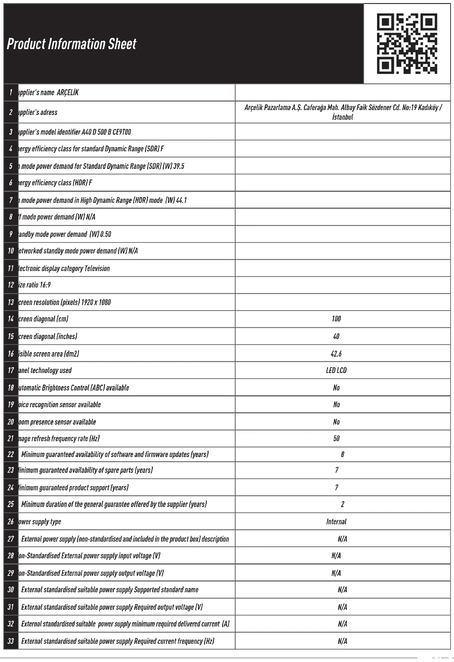 Caractéristiques techniques Téléviseur Arçelik A40 D 500 B, écran 40 pouces, résolution Full HD (1920 x 1080), technologie LED