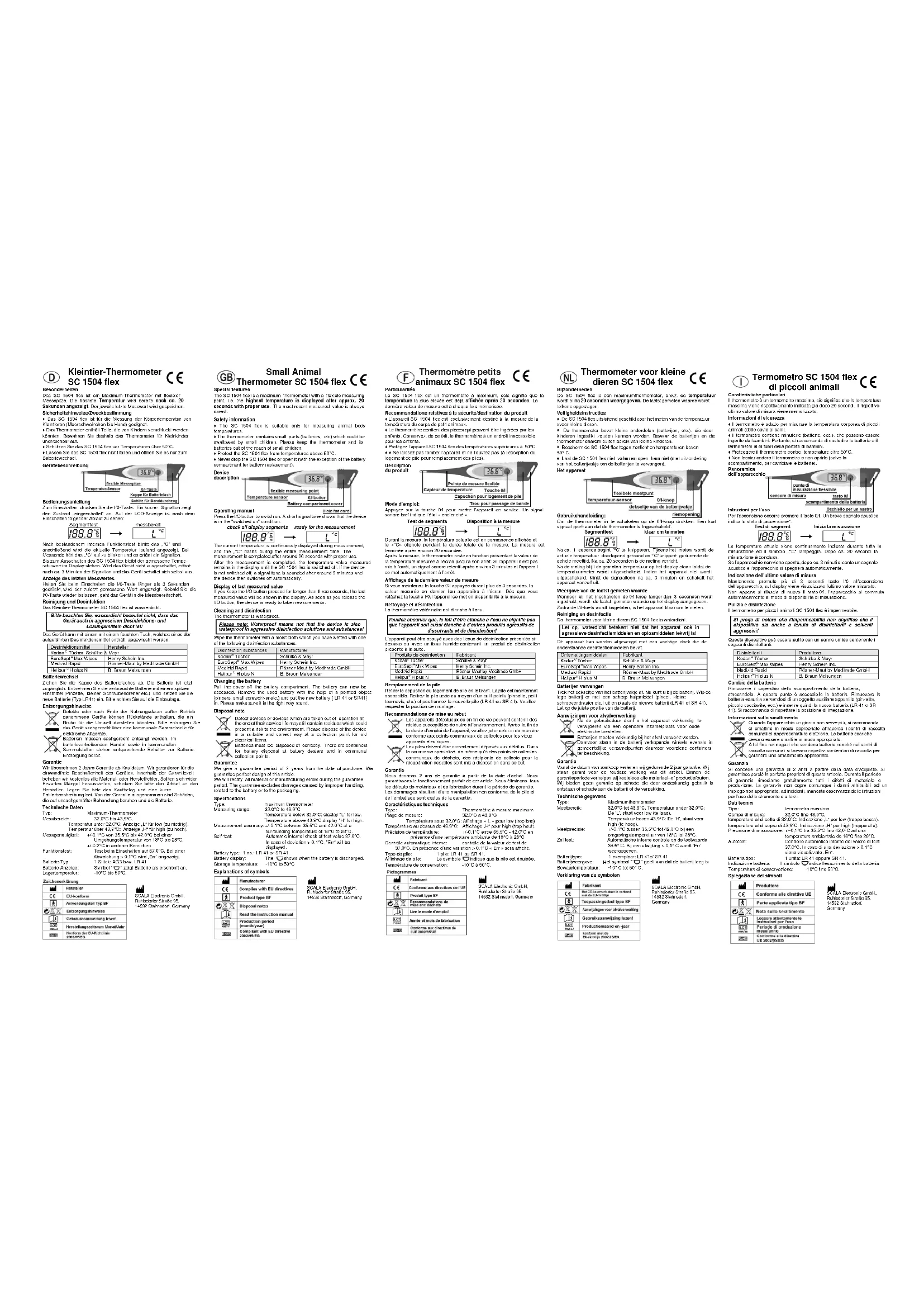 Thermomètre petits animaux SC 1504 flex Particularités Le SC 1504 flex est un thermomètre à maximum, cela signifie que la température la plus élevée est déjà affichée après 20 secondes. La dernière valeur de mesure est à chaque fois mémorisée. Recommandations relatives à la sécurité/destination du produit ♦ L’appareil SC 1504 flex est exclusivement destiné à la mesure de la température du corps de petit animaux. ♦ Le thermomètre contient des pièces qui peuvent être ingérées par les enfants. Conservez, de ce fait, le thermomètre à un endroit inaccessible pour les enfants. ♦ Protégez l’appareil SC 1504 flex des températures supérieures à 50°C. ♦ ♦ Ne laissez pas tomber l’appareil et ne l'ouvrez pas (à l’exception du logement de pile pour remplacement des piles). Description du produit