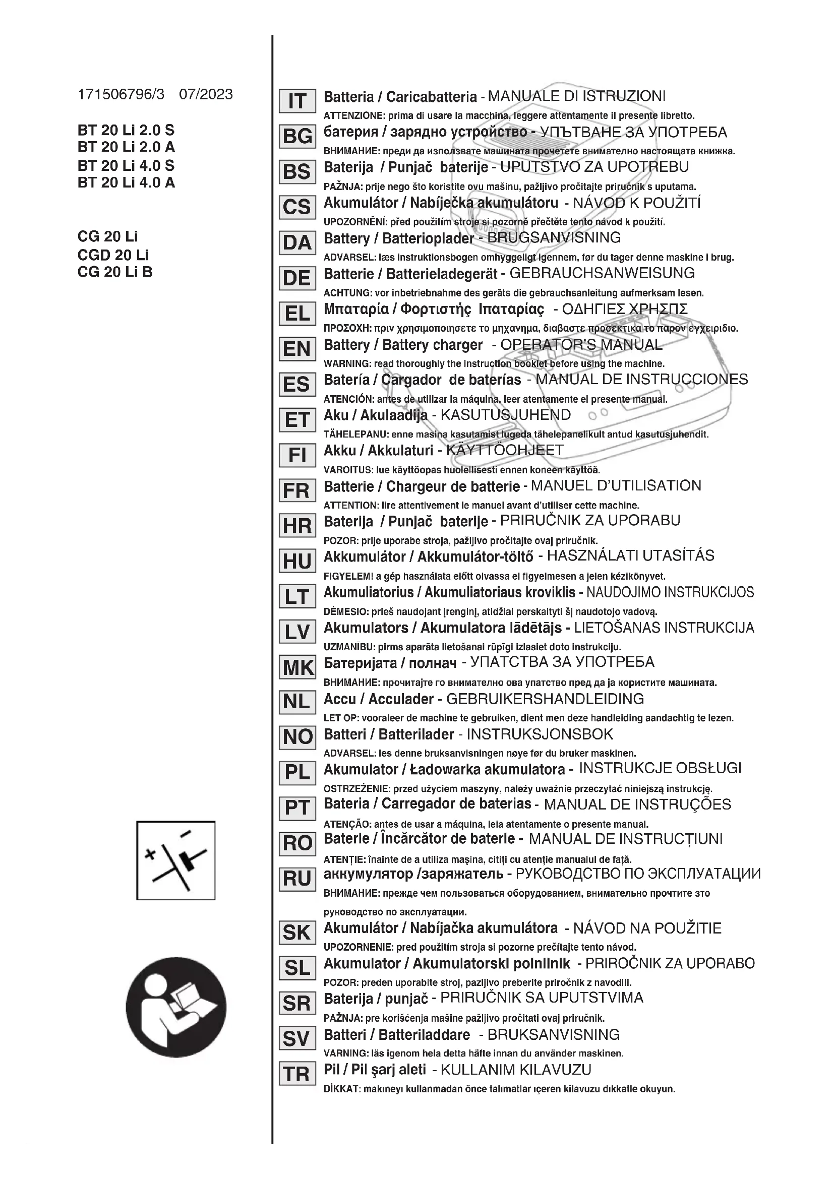 - Avant son utilisation pour la première fois après achat (la batterie n’est pas fournie complètement chargée);• Avant toute période d'inactivité prolongée (plus de 30 jours) (par. 7) ;• Avant de la mettre en service après une période d’inactivité prolongée.Le non-respect de cette procédure ou le manque de charge peut provoquer des dommages irrémédiables aux éléments de la batterie. Une batterie déchargée doit être rechargée au plus vite.REMARQUE La batterie peut être rechargée à tout moment, même partiellement, sans aucun risque de l’abîmer.REMARQUE La batterie est munie d’une protection qui empêche son rechargement si la température de la batterie n’est pas comprise entre 0° et +40 °C.1. Brancher le chargeur sur une prise AC (1).2. Placer la batterie (2) sur le chargeur (3).3. Les voyants à LED du chargeur (4) et de la batterie (5) s’allument dans un ordre spécique pour établir l’état actuel de la batterie.CG 20 LiCGD 20 Li