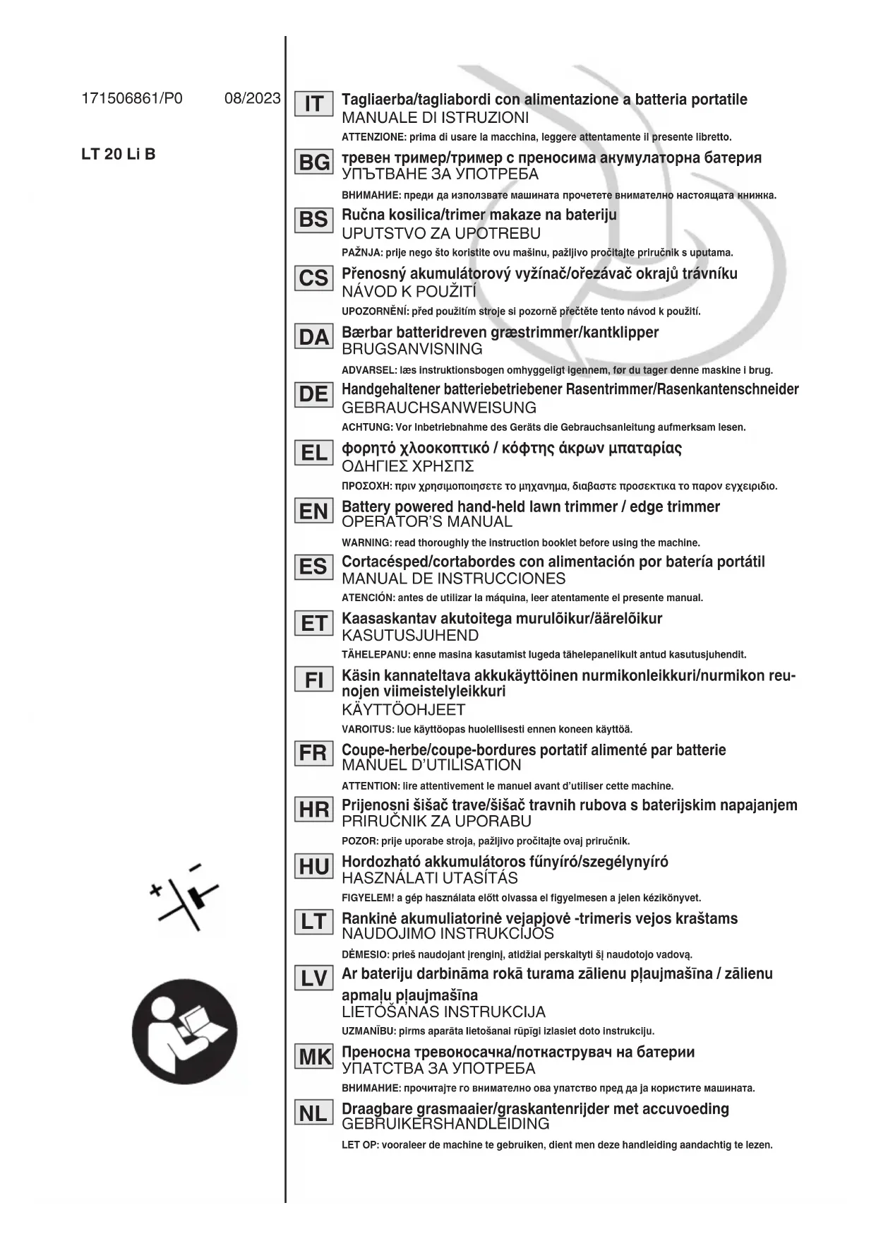 Il existe diérents dispositifs pour recharger la batterie. Les batteries homologuées pour cette machine sont listées dans le tableau « Données Techniques »HR – 1 POZOR: PRIJE UPORABE STROJA PAŽLJIVO PROČITAJTE OVAJ PRIRUČNIK. Čuvajte za buduće potrebe.
