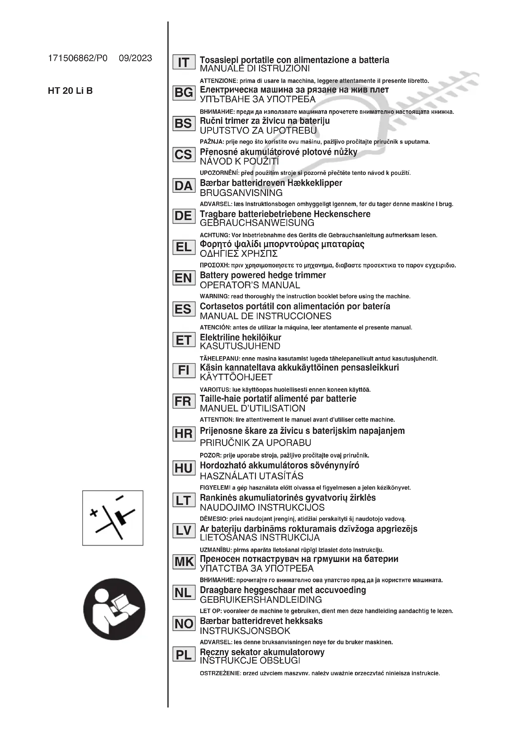 Il existe diérents dispositifs pour recharger la batterie. Les batteries homologuées pour cette machine sont listées dans le tableau « Données tech- niques. »FR - 16HR – 1 POZOR: PRIJE UPORABE STROJA PAŽLJIVO PROČITAJTE OVAJ PRIRUČNIK. Čuvajte za buduće potrebe.