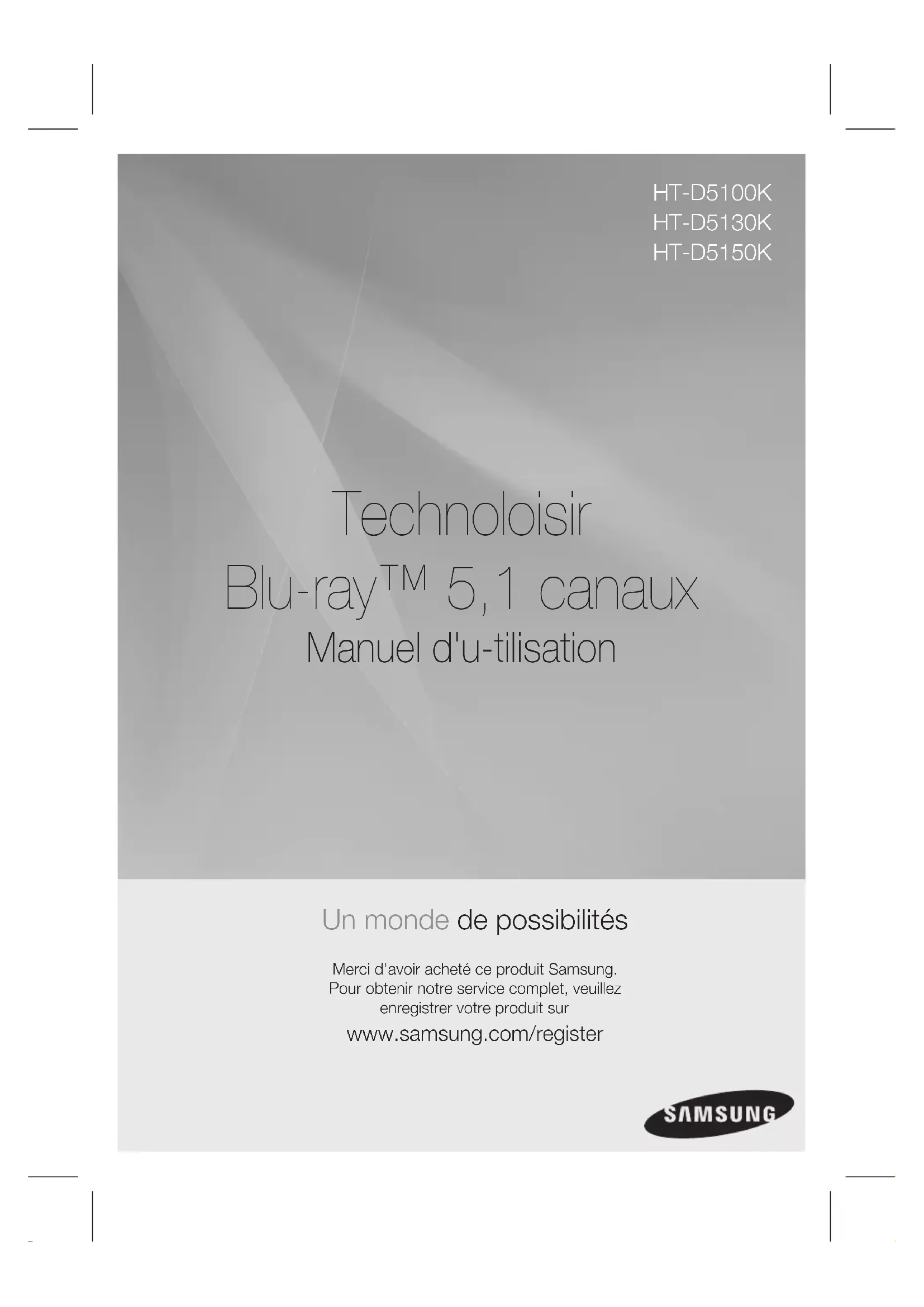 Technoloisir Blu-ray™ 5,1 canaux Manuel d'u-tilisation Un monde de possibilités Merci d'avoir acheté ce produit Samsung. Pour obtenir notre service complet, veuillez enregistrer votre produit sur www.samsung.com/register HT-D5100K HT-D5130K HT-D5150K2 French French 3 Consignes de sécurité Avertissements de sécurité POUR RÉDUIRE LES RISQUES D’ÉLECTROCUTION, NE RETIREZ JAMAIS LE CAPOT (NI L’ARRIÈRE). LES PIÈCES DECE PRODUIT NE SONT PAS RÉPARABLES PAR L’UTILISATEUR. VEUILLEZ CONTACTER UN TECHNICIEN QUALIFIÉ POUR TOUTE RÉPARATION. ATTENTION : RISQUE D’ÉLECTROCUTIONNE PAS OUVRIRLe symbole représentant un éclair terminé par une èche dans un triangle est un symbole d’avertissement indiquant la présence d’une tension dangereuse à l’intérieur du produit.ATTENTION : AFIN DE LIMITER LES RISQUES D'ÉLECTROCUTION, NE RETIREZ JAMAIS LE COUVERCLE (OU LE CACHE ARRIÈRE). CONFIEZ L’ENTRETIEN DE CET APPAREIL À UNE PERSONNE QUALIFIÉE.Le symbole représentant un point d’exclamation dans un triangle est un symbole d’avertissement indiquant des instructions importantes concernant le produit.AVERTISSEMENT An de réduire tout risque d’incendie ou d’électrocution, n’exposez jamais cet appareil à la pluie ou à l’humidité. ATTENTIONÉvitez toute projection d’eau sur l’appareil et ne posez jamais d’objet contenant un liquide dessus (ex : un vase).La che permet de débrancher l’appareil et doit toujours être facilement accessible.