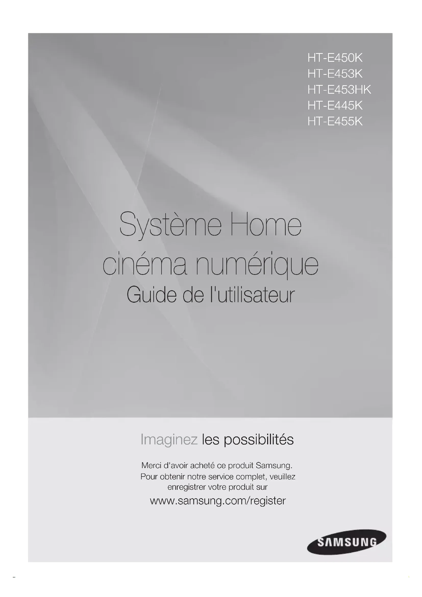 Système Home cinéma numérique Guide de l'utilisateur Imaginez les possibilités Merci d'avoir acheté ce produit Samsung.Pour obtenir notre service complet, veuillez enregistrer votre produit sur www.samsung.com/register HT-E450K HT-E453K HT-E453HK HT-E445K HT-E455K2 Français Consignes de sécurité Avertissements de sécurité POUR RÉDUIRE LES RISQUES D’ÉLECTROCUTION, NE RETIREZ JAMAIS LE CAPOT (NI L’ARRIÈRE).LES PIÈCES DE CE PRODUIT NE SONT PAS RÉPARABLES PAR L’UTILISATEUR. VEUILLEZ CONTACTER UN TECHNICIEN QUALIFIÉ POUR TOUTE RÉPARATION. ATTENTION RISQUE D’ÉLECTROCUTIONNE PAS OUVRIRCe symbole indique la présence d’une tension dangereuse dans l’appareil, présentant un risque d’électrocution ou de blessures.ATTENTION : AFIN D’ÉVITER TOUT RISQUE D’ÉLECTROCUTION, LA BROCHE LA PLUS LARGE DE LA FICHE DOIT ÊTRE TOTALEMENT INSÉRÉE DANS LE TROU PLUS LARGE.Ce symbole indique les directives importantes qui accompagnent le produit. AVERTISSEMENT