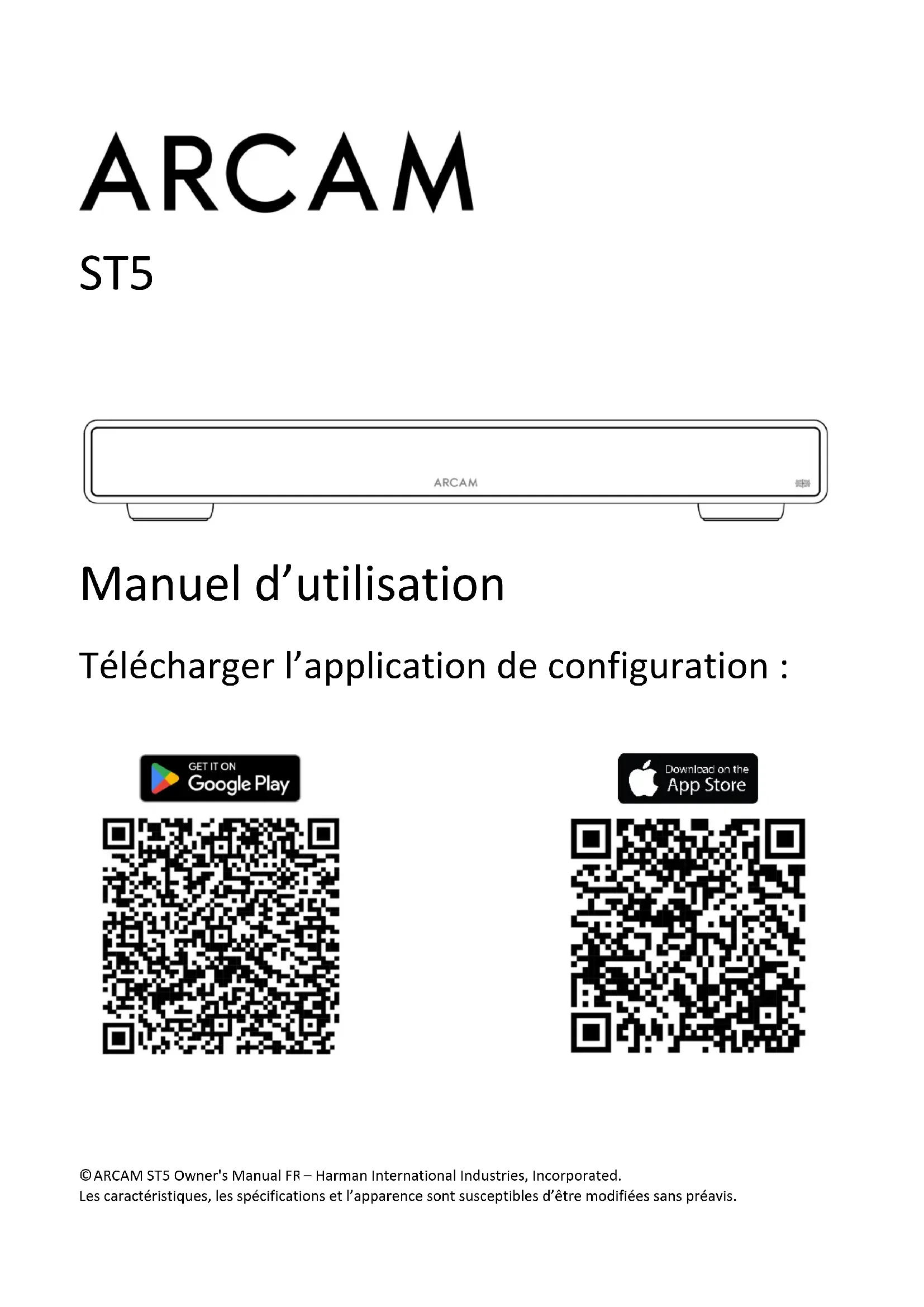- Marques commerciales et Licences ARCAM ST5 Owner's Manual FR Merci d’avoir choisi ARCAM Depuis plus de 45 ans, ARCAM fabrique des produits hi-fi et home-cinéma sophistiqués offrant une qualité sonore de pointe. L’ARCAM ST5 est le dernier né d’une longue lignée de produits audio numériques primés, qui remonte à notre premier lecteur CD, l’ARCAM Delta 70, créé en 1986, et au premier DAC séparé au monde, le Delta Black Box, créé en 1988. L’ARCAM ST5 offre un ensemble complet de fonctionnalités prenant en charge la plupart des smartphones et des tablettes, ainsi que les services de streaming les plus répandus. Connectez le ST5 à votre réseau domestique par Wi- Fi ou Ethernet pour profiter d’une lecture instantanée avec Apple Airplay2 ou Google Chromecast. Le ST5 lit la musique directement à partir de Spotify Connect et Tidal Connect ; et pour les utilisateurs avertis, le ST5 est compatible avec Roon. Dans le cas improbable d’une panne ou si vous avez besoin d’une assistance technique, veuillez contacter nos équipes d’assistance spécialisées par courrier électronique à l’adresse luxurysupport@harman.com,ou par téléphone au numéro +44 1707 668 012 ou au numéro +1 888 691 4171. Si vous souhaitez simplement obtenir de plus amples informations sur les produits ARCAM, notre réseau de revendeurs se fera un plaisir de vous aider. D’autres informations sont disponibles sur notre site web d’ARCAM à l’adresse www.arcam.co.uk. Contenu du paquet Lecteur de musique en continu ARCAM ST5 Télécommande IR 2 piles AAA pour la télécommande Cordons d’alimentation spécifiques aux régions Câble de contrôle RJ11 Guide de démarrage rapide Document de sécurité et de conformité Mise en place de l’appareil Posez le streamer sur une surface plane et ferme, en évitant de l’exposer directement aux rayons du soleil ou à une source de chaleur ou d’humidité. Ne posez pas le ST5 au-dessus d’un amplificateur ou de toute autre source de chaleur. Assurez-vous que le récepteur de la télécommande sur la gauche de l’affichage de la façade n’est pas obstrué, sinon cela peut générer l’utilisation de la télécommande. Ne posez pas votre platine-disque sur cet appareil. Les platines sont des appareils très sensibles aux bruits générés par l’alimentation secteur. Ces derniers peuvent s’entendre en bruit de fond si la platine est trop proche de l’appareil. Le fonctionnement normal de l’appareil peut être gêné par de fortes perturbations électromagnétiques. Si cela se produit, il suffit de réinitialiser l’appareil avec le bouton d’alimentation, ou de déplacer l’appareil dans un autre lieu. Ce produit offre à l’utilisateur la possibilité de désactiver les fonctions de gestion de l’alimentation électrique. Notez que cette option augmentera la consommation d’énergie du produit.5 ARCAM ST5 Owner's Manual FR Façade p. 154