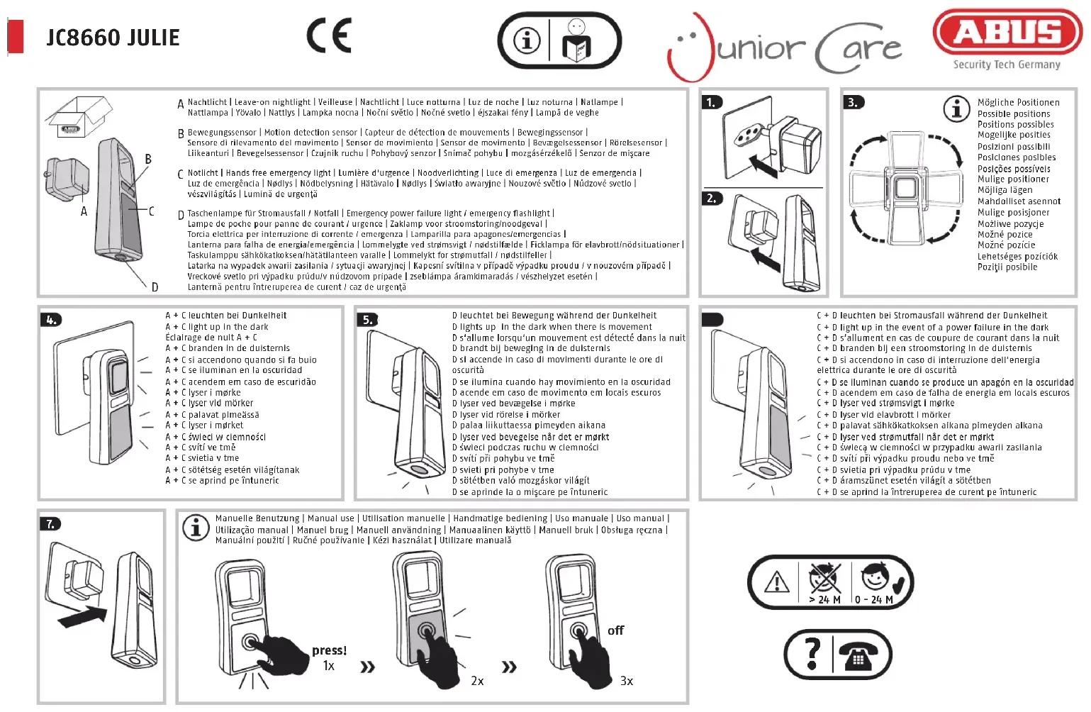 - Colour temperature: 6500 Kelvin ATTENTION: Veuillez lire cette notice attentivement avant le montage et la mise en service. Conservez cette notice d’utilisation et donnez à tous les utilisateurs les instructions sur la façon de l’utiliser. Utilisation exclusivement réservée aux adultes ! Cet appareil est uniquement conçu pour l’usage dans des locaux fermés. À n’utiliser que dans des prises murales où l’éclairage de nuit ne peut pas entrer en contact avec la literie ou d’autres matériaux. Ne pas faire fonctionner avec une rallonge. ABUS décline toute responsabilité pour des vices et dommages résultant d’une utilisation incorrecte, de l’usure normale ou de la non-observation des présentes instructions. Le produit ne vous dispense pas de superviser les enfants. Toujours surveiller les enfants ! Ne pas utiliser comme jouet ! Caractéristiques techniques