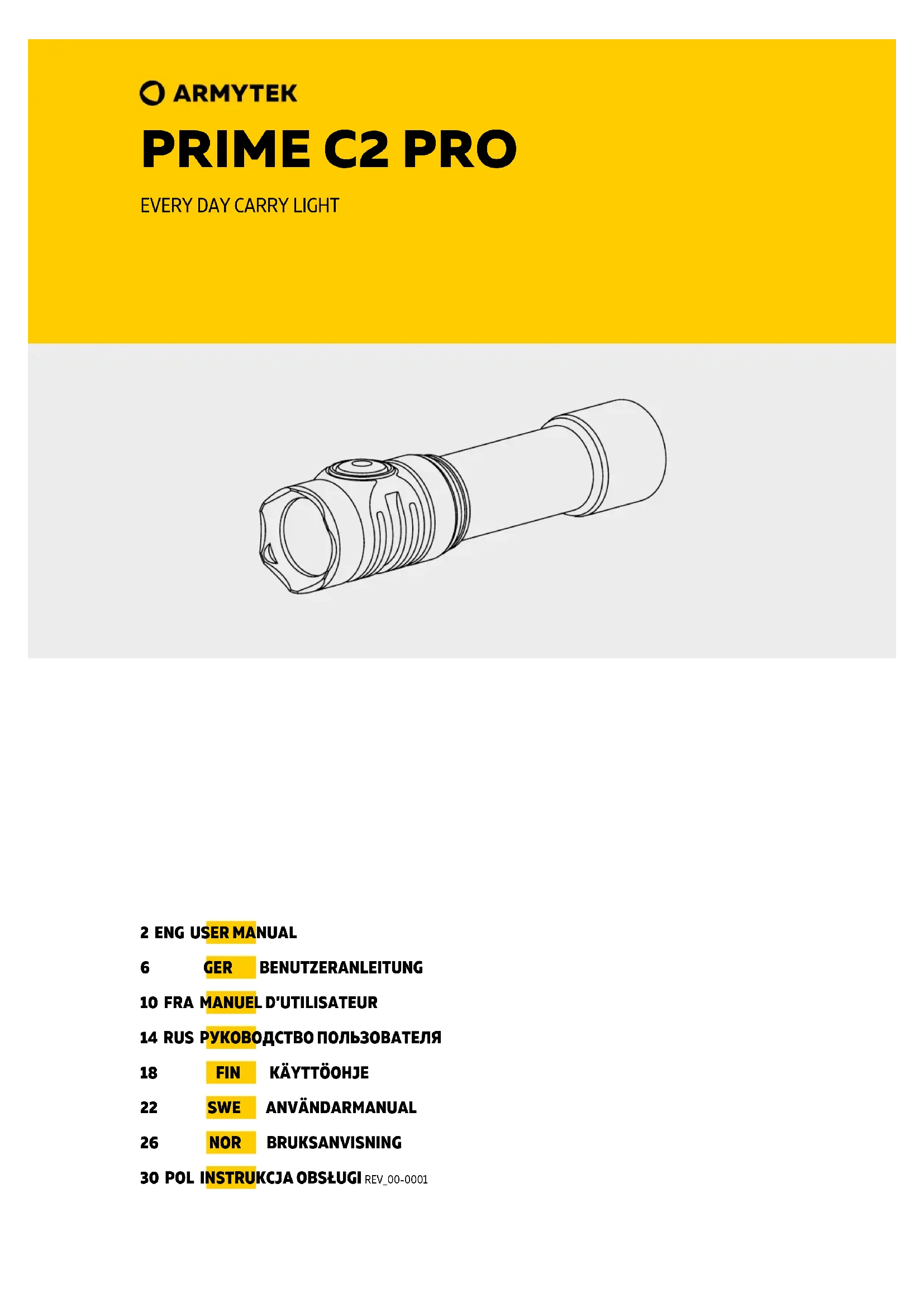 Merci d’avoir choisi le produit Armytek. Nous vous prions de prendre connaissance de la notice avant l’utilisation. Nom du modèle Prime С2 Pro (White)LED/Type d'optique Cree XHP50.2/TIRStabilisation de la luminosité COMPLÈTE (lumière constante)Flux lumineux 2400 lmForce maximale de la lumière 3800 cdUn faisceau focalisé : Un faisceau large 70°:120° Portée lumineuse 123 mModes, flux lumineux et temps de fonctionnement (les mesures ont été faites pour batterie 18650 Li-Ion 3500 mAh avant que la luminosité ne tombe à 10% de la luminosité d'origine)Turbo3 2400 lm/2 h 48 min (610 lm au bout de 30 sec)Turbo2 1710 lm/2 h 48 min (610 lm au bout de 1 min 30 sec)Turbo1 815 lm/2 h 44 min (610 lm au bout de 22 min)Base3 350 lm/5 h 20 minBase2 150 lm/12 h 30 minBase1 40 lm/40 h 30 minLuciole3 5 lm/12 joursLuciole2 1 lm/40 joursLuciole1 0.15 lm/200 joursStrob3 2400 lm/10 Hz/5 h 45 min (610 lm au bout de 2 min)Strob2 2400 lm/1 Hz/12 h (610 lm au bout de 10 min)Strob1 150 lm/1 Hz/55 hAlimentation 1x18650 Li-Ion La longueur/diamètre du corps/diamètre de la tête 117.7 mm/20.5 mm/25.4 mm Poids sans/avec batterie 68 g/118 g Immersion dans l'eau et Résistance aux chocs IP68, 10 m de profondeur pendant 2 h. Chute d'une hauteur allant jusqu’à 10 m X Par rapport aux lampes à lumière blanche, le flux lumineux des lampes à lumière chaude est inférieur d'environ 7%, et la portée du faisceau est inférieure d'environ 3%. Toutes les données présentées ci-dessus ont été mesurées conformément à la norme ANSI/NEMA FL1-2009. Les tests sont eectués sur la batterie fournie. Les données peuvent varier en fonction des conditions environnementales, de la dissipation thermique et d'autres facteurs.11Prime C2 PRO MANUEL D’UTILISATEUR FRA REV_00-0001 Contenu de livraison Lampe, batterie 18650 Li-Ion 3500 mAh, chargeur USB magnétique, clip, étui, 2 joints toriques de rechange, manuel d'utilisateur. Le fabricant se réserve le droit de modifier la configuration à sa propre convenance sans apporter de modifications au manuel. Les spécifications peuvent être modifiées sans avis préalable. Préparations préalables POUR INSTALLER/REMPLACER LA BATTERIE :