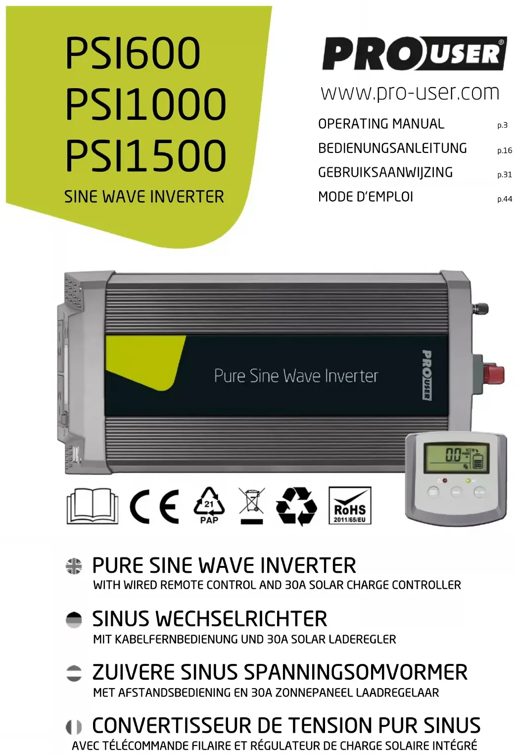 Les CONVERTISSEURS SINUSOIDAUX fabriqués par PRO USER font partie d'une nouvelle gamme de convertisseurs de tension extrêmement efficaces dont la capacité d'absorption de tension est optimale. Ces unités sont à la pointe du progrès. Votre CONVERTISSEUR SINUSOÏDAL Pro-User vous garantit une courbe SINUSOÏDALE PURE de 230V 50Hz. En vous branchant sur une batterie 12V. En complément nous avons intégré 2 chargeurs USB qui vous permettent de recharger directement votre Smartphone, Tablette ou tout autre appareil rechargeable via USB. Grâce à la haute qualité du signal électrique, mêmes les appareils les plus sensibles fonctionnent parfaitement avec ce convertisseur de tension PURE SINUS. La télécommande filaire vous permet de surveiller et de contrôler votre convertisseur de manière très commode. Avec le contrôleur de charge solaire intégré (seulement PSI1000 & PSI1500) vous pouvez même connecter directement les panneaux solaires photovoltaïques jusqu'à 500W au convertisseur pour recharger votre batterie. Cette série de convertisseurs de tension a été soigneusement conçue et produite pour que les produits vous soient utiles à tout moment et qu'ils vous assistent de manière fiable. Veuillez lire le mode d'emploi attentivement avant que vous mettiez l'article en service car il contient des informations importantes de sécurité. Ne pas respecter les consignes de ce manuel peux conduire a des accident avec risque de de dommage corporel et matériels. Si cet appareil est transmis à une personne tierce, le mode d’emplois doit être aussi transmit.