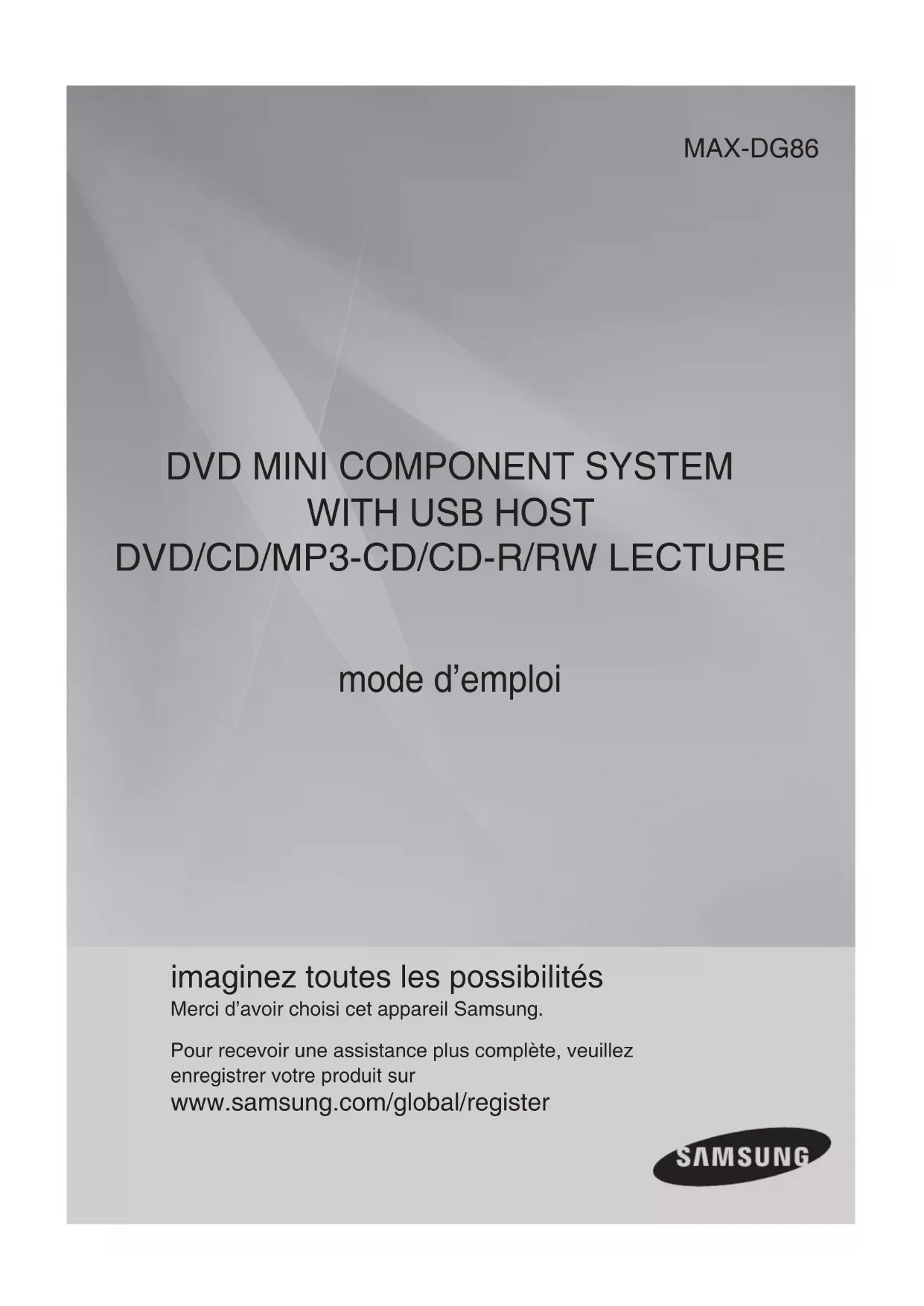 DVD/CD/MP3-CD/CD-R/RW LECTURE mode d’emploi imaginez toutes les possibilités Merci d’avoir choisi cet appareil Samsung. Pour recevoir une assistance plus complète, veuillez enregistrer votre produit sur www.samsung.com/global/register MAX-DG86-Latin-FRA-1-090505.indd 3MAX-DG86-Latin-FRA-1-090505.indd 3 2009-5-6 10:07:492009-5-6 10:07:491