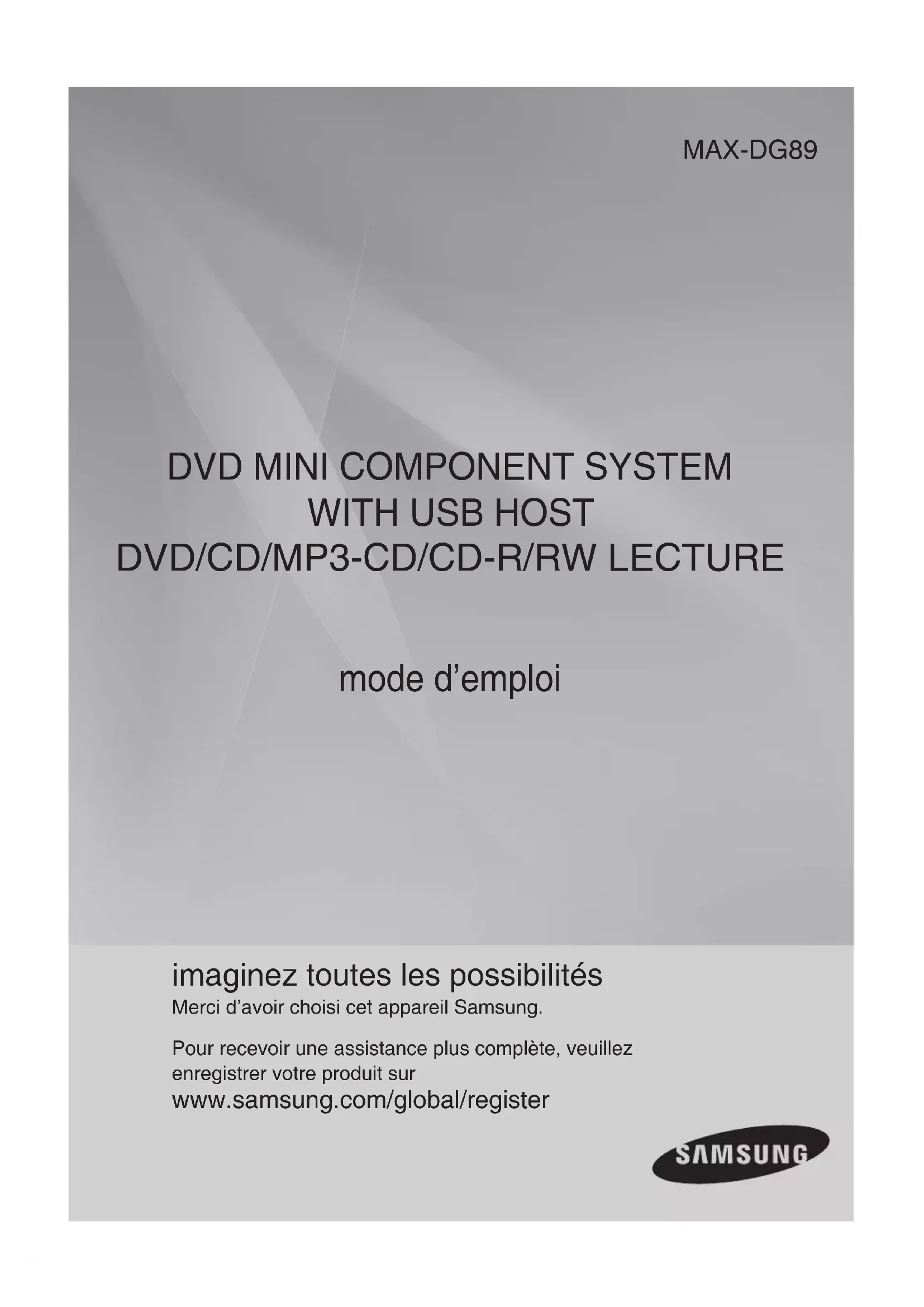 DVD/CD/MP3-CD/CD-R/RW LECTURE mode d’emploi imaginez toutes les possibilités Merci d’avoir choisi cet appareil Samsung. Pour recevoir une assistance plus complète, veuillez enregistrer votre produit sur www.samsung.com/global/register MAX-DG89-Latin-FRA-1-090509.indd 3MAX-DG89-Latin-FRA-1-090509.indd 3 2009-5-14 11:33:212009-5-14 11:33:211