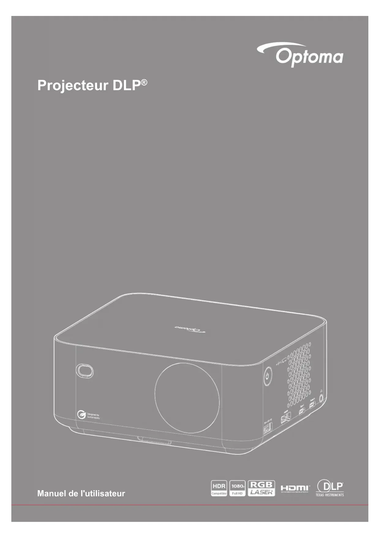 INTRODUCTION Nous vous remercions d'avoir acheté ce projecteur laser Optoma. Pour obtenir la liste complète des caractéristiques, veuillez consulter la page du produit sur notre site Web, où vous trouverez également des informations et de la documentation supplémentaires telles que la FAQ. Contenu du paquet Déballez avec précaution et vériez que vous avez les éléments suivants en plus des accessoires standard. Certains des éléments pour des accessoires en option peuvent ne pas être disponibles en fonction du modèle, de la spécication et de votre région d'achat. Consultez votre point de vente à ce sujet. Certains accessoires peuvent varier d'une région à l'autre. La carte de garantie n'est fournie que dans certaines régions. Consultez votre revendeur pour plus d'informations. Accessoires standard Projecteur Télécommande Câble d'alimentation Documentation Manuel de démarrage rapide Enter Adaptateur d'alimentation Sac de transport Remarque :