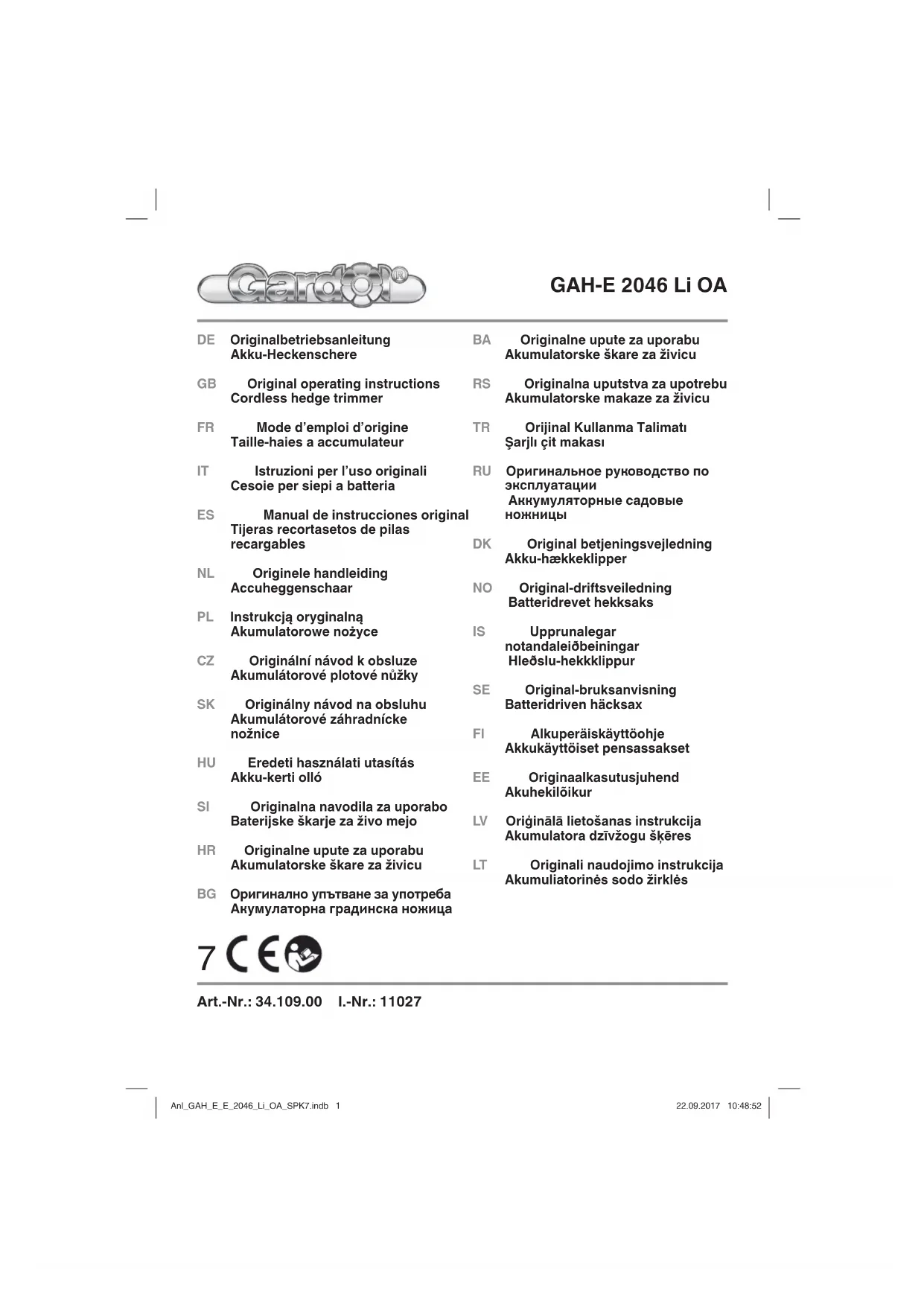 Uniquement pour les pays de l’Union Européenne Ne jetez pas les outils électriques dans les ordures ménagères! Selon la norme européenne 2012/19/CE relative aux appareils électriques et systèmes électroniques usés et selon son application dans le droit national, les outils électriques usés doivent être récoltés à part et apportés à un recyclage respectueux de l’environnement. Possibilité de recyclage en alternative à la demande de renvoi : Le propriétaire de l’appareil électrique est obligé, en guise d’alternative à un envoi en retour, à contribu- er à un recyclage eff ectué dans les règles de l’art en cas de cessation de la propriété. L’ancien appareil peut être remis à un point de collecte dans ce but. Cet organisme devra l’éliminer dans le sens de la Loi sur le cycle des matières et les déchets. Ne sont pas concernés les accessoires et ressources fournies sans composants électroniques. Toute réimpression ou autre reproduction de la documentation et des papiers joints aux produits, même sous forme d’extraits, est uniquement permise une fois l’accord explicite de l’ISC GmbH obtenu. Sous réserve de modifi cations techniques Anl_GAH_E_E_2046_Li_OA_SPK7.indb 29Anl_GAH_E_E_2046_Li_OA_SPK7.indb 29 22.09.2017 10:49:2322.09.2017 10:49:23FR