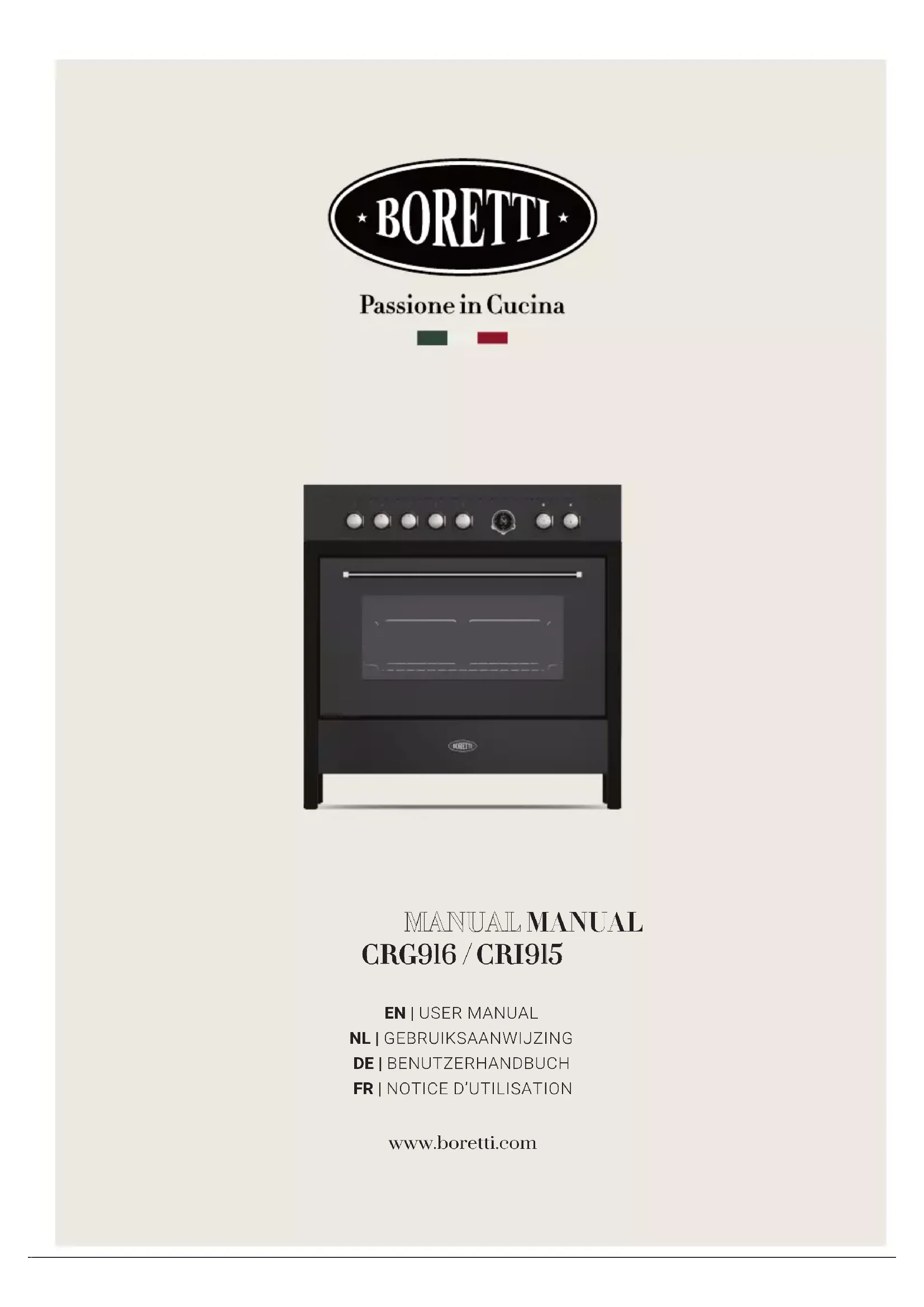 www.boretti.com204 Introduction Félicitations! Vous êtes maintenant officiellement propriétaire d'une cuisinière Boretti. Dans les années à venir, vous découvrirez que l'utilisation d'une cuisinière Boretti apporte une nouvelle dimension à la cuisine. Nous vous recommandons de lire attentivement toutes les instructions de ce manuel. Il contient des informations détaillées sur les conditions les plus appropriées pour utiliser la cuisinière correctement et en toute sécurité. Ces instructions vous aideront également à vous familiariser avec chaque composant. Des conseils utiles vous sont offerts pour l'utilisation des récipients, des ustensiles, des positions des guides et des réglages des commandes. Les opérations correctes de nettoyage mentionnées dans ce manuel vous permettent de maintenir les performances de la cuisinière inchangées dans le temps. Les différentes sections sont présentées de manière à vous permettre de vous familiariser avec toutes les fonctions de la cuisinière. Le texte est facile à comprendre et est accompagné d'images détaillées et de pictogrammes simples. En lisant attentivement ce manuel, vous trouverez la réponse à toutes vos questions pour utiliser correctement votre nouvelle cuisinière. Nous vous souhaitons beaucoup de plaisir en cuisine! Boretti FRBoretti Manuel CRG916 / CRI915 / Manuel - Conseil d’installation205 Table des matières