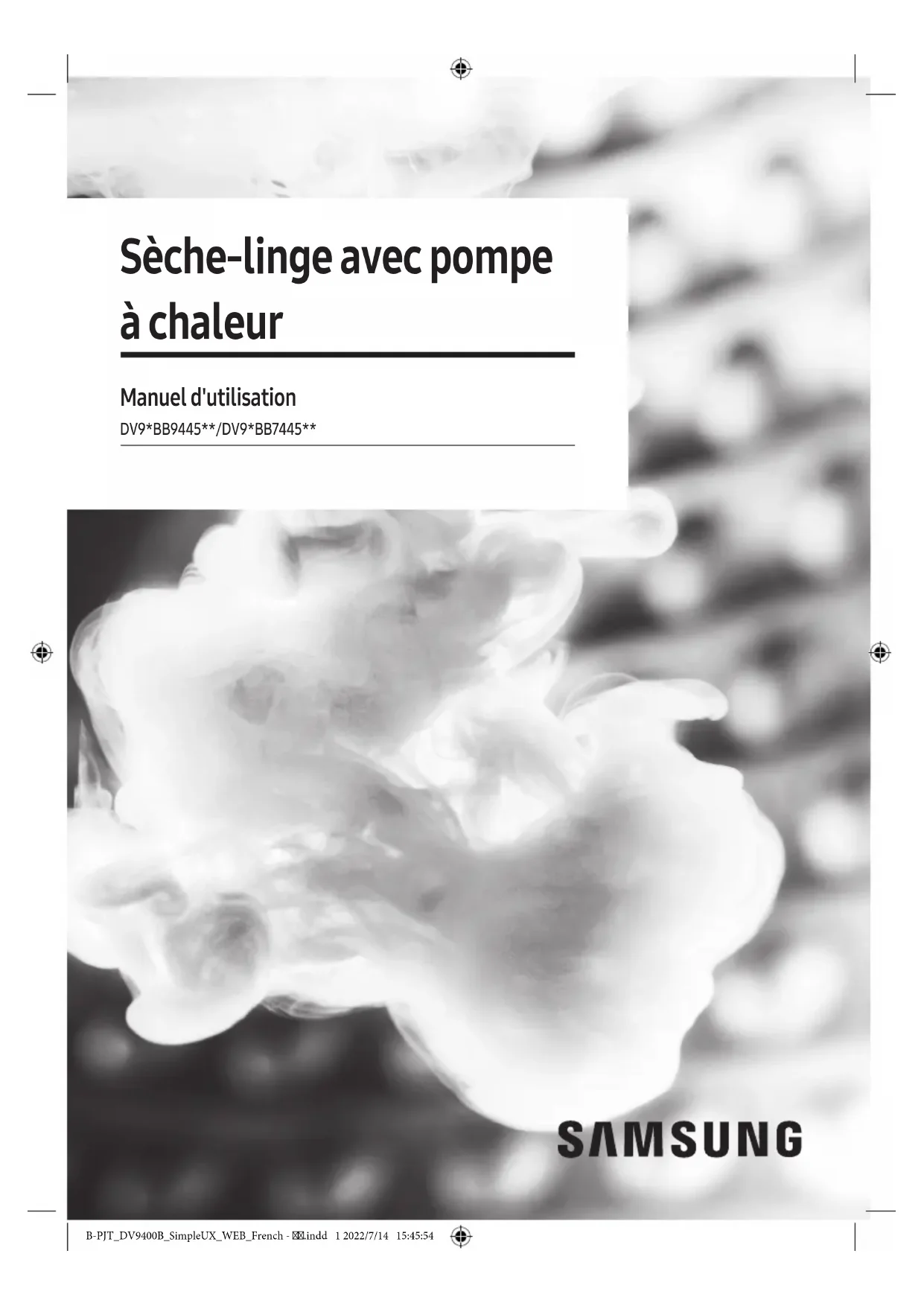 Sèche-linge avec pompe à chaleur Manuel d'utilisation DV9*BB9445**/DV9*BB7445** B-PJT_DV9400B_SimpleUX_WEB_French - .indd 1 2022/7/14 15:45:54Français Français2 Sommaire Consignes de sécurité 4 Ce que vous devez savoir concernant les consignes de sécurité 4 Symboles de sécurité importants 4 Consignes de sécurité importantes 5 Pour minimiser le risque d'incendie sur un sèche-linge à tambour, les précautions suivantes doivent être respectées. 8 Avertissements importants concernant l'installation 10 Avertissements importants concernant l'utilisation 11 Mises en garde concernant l'utilisation 12 Avertissements importants concernant le nettoyage 13 Entretien pour éviter la formation de gel 14 Instructions concernant les déchets DEEE 14 Installation 15 Ce qui est fourni 15 Exigences d'installation 17 Installation étape par étape 18 Inversion du hublot 22 Environnement 26 Avant de commencer 27 Configuration initiale 27 Consignes de séchage 28 Opérations 30 Panneau de commande 30 Lancement d'un cycle 32 Présentation des cycles 33 Options 36 Fonctions système 38 Fonctions spéciales 40 Entretien 44 Vidage du réservoir d'eau 44 Nettoyage 45 B-PJT_DV9400B_SimpleUX_WEB_French - .indd 2 2022/7/14 15:45:55Français Français 3 Dépannage 50 Contrôles 50 Codes d'information 52