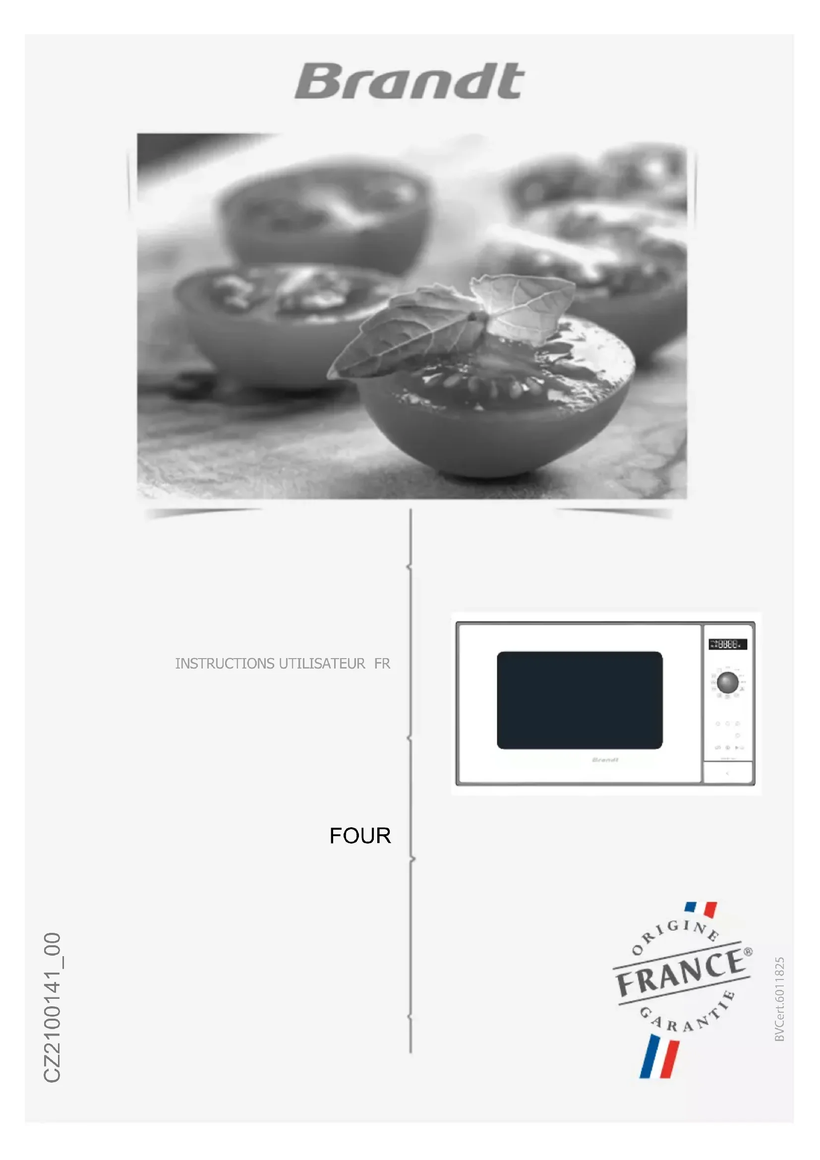 FOUR CZ2100141_00Tables des matières https://brandt.fr/ BVCert.6011825 IMPORTANT : Avant de mettre votre appareil en marche, veuillez lire attentivement ce guide an de vous familiariser plus rapidement avec son fonctionnement. Le label « Origine France Garantie » assure au consommateur la tra- çabilité d’un produit en donnant une indication de provenance claire et objective. La marque BRANDT est ère d’apposer ce label sur les produits issus de nos usines françaises basées à Orléans et Vendôme. Chère Cliente, Cher Client, Vous venez d’acquérir un produit BRANDT et nous vous remercions de la conance que vous nous accordez. Nous avons conçu et fabriqué ce produit en pensant à vous, à votre mode de vie, à vos besoins, pour qu’il réponde au mieux à vos attentes. Nous y avons mis notre savoir-faire, notre esprit d’innovation et toute la passion qui nous anime depuis plus de 60 ans. Dans un souci permanent de toujours mieux satisfaire vos exigences, notre service consommateurs est à votre disposition et à votre écoute pour répondre à toutes vos questions ou suggestions. Connectez-vous aussi sur notre site www.brandt.com où vous trouverez nos dernières innovations, ainsi que des informations utiles et complémentaires. BRANDT est heureux de vous accompagner au quotidien et vous souhaite de proter pleinement de votre achat.3 Tables des matières