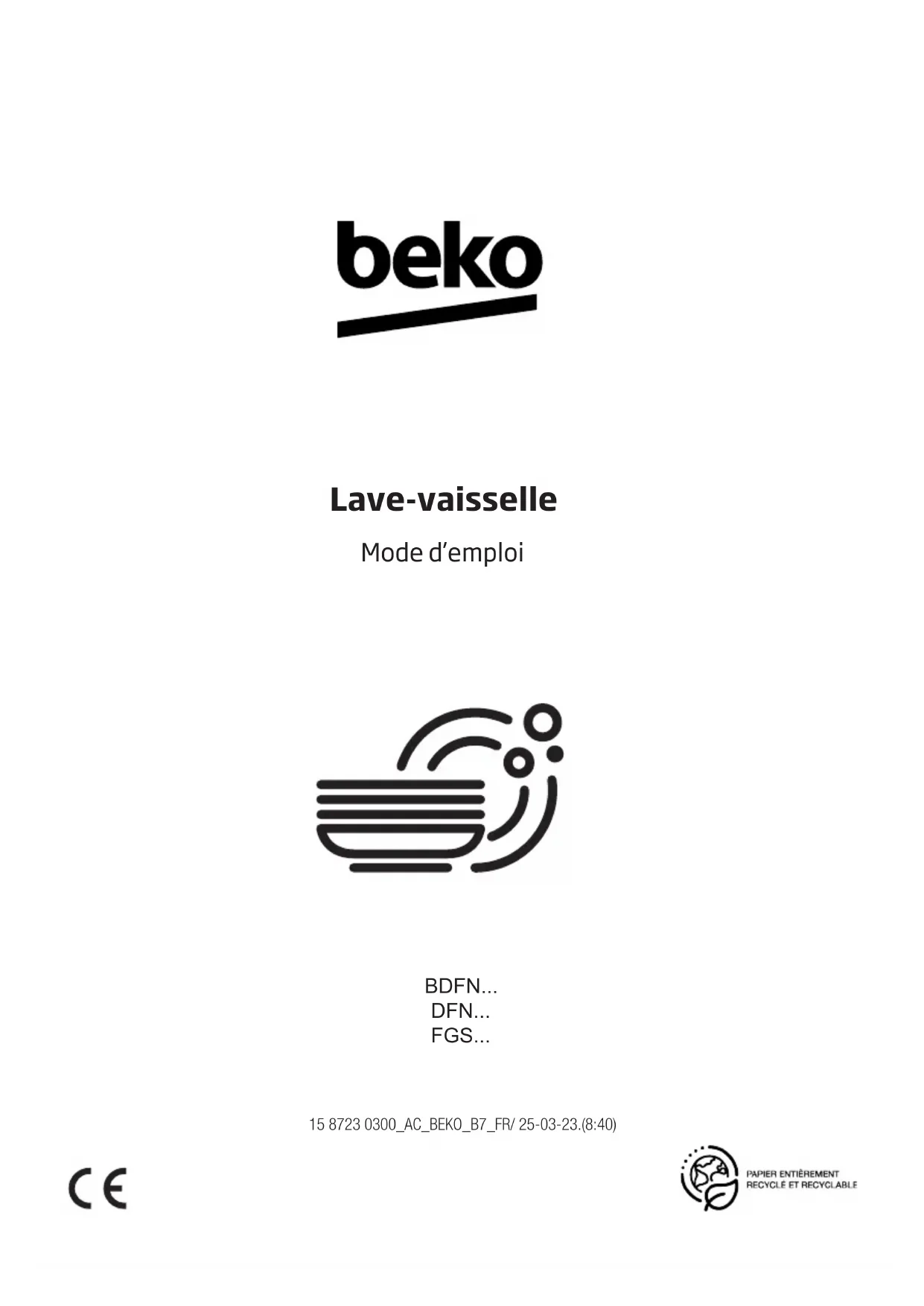 Lave-vaisselle Mode d’emploi 15 8723 0300_AC_BEKO_B7_FR/ 25-03-23.(8:40) BDFN... DFN... FGS...Les symboles suivants sont utilisés dans le manuel d’utilisation et sur l’emballage : Danger pouvant entraîner des blessures voire la mort. AVIS Danger pouvant entraîner des dommages au produit ou à son environnement. Informations importantes ou conseils utiles pour l’utilisation Veuillez lire ce manuel d’utilisateur. Cher client, Veuillez lire le présent manuel d’utilisation avant d’utiliser le produit. Merci d’avoir choisi ce produit Beko. Nous espérons que vous obtiendrez les meilleurs résultats avec notre produit fabriqué à partir d’une technologie de pointe et de matériaux de qualité supérieure. C’est pourquoi nous vous recommandons, avant d’utiliser ce produit, de lire attentivement ce manuel et tous les autres documents fournis. Veillez à bien respecter les consignes et les instructions figurant dans le manuel d’utilisation. Ainsi, vous pouvez vous protéger et protéger votre produit contre les dangers potentiels. Veuillez conserver ce manuel d’utilisateur. Si vous confiez le produit à quelqu’un d’autre, n’oubliez pas de lui remettre également le manuel d’utilisation. Ce produit a été fabriqué conformément aux conditions écologiques les plus récentes.TABLE DES MATIÈRES
