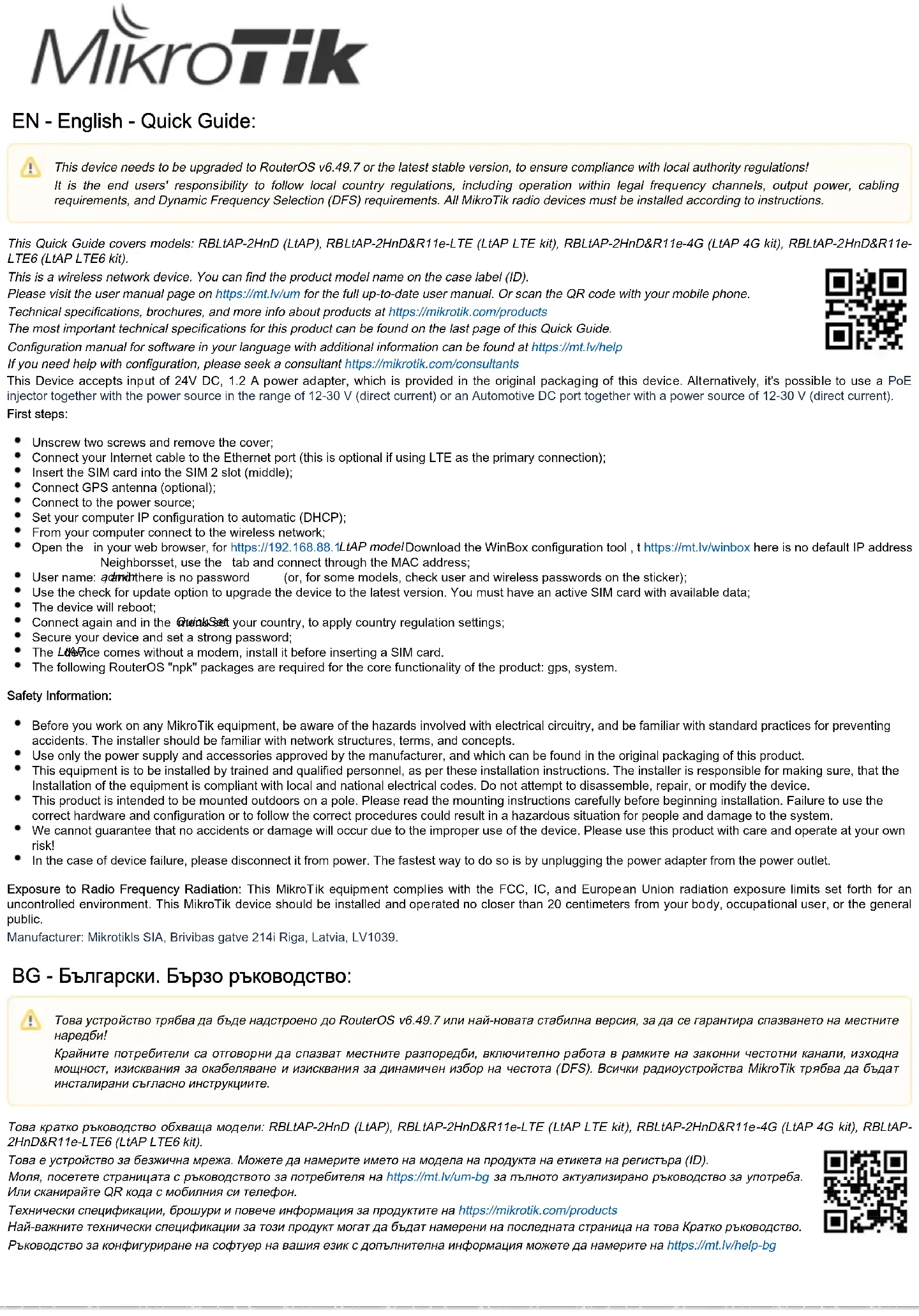 Il s'agit d'un périphérique réseau sans fil. Vous pouvez trouver le nom du modèle du produit sur l'étiquette du boîtier (ID). Veuillez visiter la page du manuel d'utilisation sur pour le manuel d'utilisation complet et à jour.https://mt.lv/um-fr Ou scannez le code QR avec votre téléphone portable. Spécifications techniques, brochures et plus d'informations sur les produits surhttps://mikrotik.com/products Les spécifications techniques les plus importantes de ce produit se trouvent sur la dernière page de ce guide rapide. Vous trouverez le manuel de configuration du logiciel dans votre langue avec des informations supplémentaires sur https://mt.lv/help-fr Si vous avez besoin d'aide pour la configuration, veuillez consulter un consultant https://mikrotik.com/consultants Cet appareil accepte l'entrée d'un adaptateur d'alimentation 24 V CC, 1,2 A, fourni dans l'emballage d'origine de cet appareil. Alternativement, il est possible d'utiliser l' injecteur PoE avec la source d'alimentation dans la plage 12-30 V (courant continu) ou le port DC automobile avec la source d'alimentation 12-30 V (courant continu). Premiers pas: Dévissez les deux vis et retirez le couvercle; Connectez votre câble Internet au port Ethernet (ceci est facultatif si vous utilisez LTE comme connexion principale); Insérez la carte SIM dans la fente SIM 2 (au milieu); Connectez l'antenne GPS (en option); Connectez-vous à la source d'alimentation; Définissez la configuration IP de votre ordinateur sur automatique (DHCP); De votre ordinateur, connectez-vous au réseau sans fil; Ouvrez dans votre navigateur Web, pour le modèle LtAP Téléchargez l'outil de configuration WinBox , aucune adresse https://192.168.88.1 https://mt.lv/winbox IP par défaut n'est définie, utilisez l'onglet Voisins et connectez-vous via l'adresse MAC; Nom d'utilisateur: , et il n'y a pas de mot de passe; admin Utilisez l'option Vérifier la mise à jour pour mettre à niveau l'appareil vers la dernière version. Vous devez avoir une carte SIM active avec les données disponibles; L'appareil va redémarrer; Connectez-vous à nouveau et définissez votre pays dans le menu pour appliquer les paramètres de réglementation du pays; QuickSet Sécurisez votre appareil et définissez un mot de passe fort; Les appareils sont livrés sans modem, installez-le avant d'insérer une carte SIM. LtAP Les packages RouterOS "npk" suivants sont requis pour la fonctionnalité principale du produit: gps, system. Information sur la sécurité: Avant de travailler sur un équipement MikroTik, soyez conscient des dangers liés aux circuits électriques et familiarisez-vous avec les pratiques standard de prévention des accidents. Le programme d'installation doit être familiarisé avec les structures, les termes et les concepts du réseau. Utilisez uniquement l'alimentation et les accessoires approuvés par le fabricant et qui se trouvent dans l'emballage d'origine de ce produit. Cet équipement doit être installé par du personnel formé et qualifié, conformément à ces instructions d'installation. L'installateur est responsable de s'assurer que l'installation de l'équipement est conforme aux codes électriques locaux et nationaux. N'essayez pas de démonter, réparer ou modifier l'appareil. Ce produit est destiné à être monté à l'extérieur sur un poteau. Veuillez lire attentivement les instructions de montage avant de commencer l'installation. Le fait de ne pas utiliser le matériel et la configuration appropriés ou de ne pas suivre les procédures correctes peut entraîner une situation dangereuse pour les personnes et endommager le système. Nous ne pouvons garantir qu'aucun accident ou dommage ne se produira en raison d'une mauvaise utilisation de l'appareil. Veuillez utiliser ce produit avec soin et l'utiliser à vos propres risques! En cas de panne de l'appareil, veuillez le déconnecter de l'alimentation. La façon la plus rapide de le faire est de débrancher l'adaptateur secteur de la prise de courant. cet équipement MikroTik est conforme aux limites d'exposition aux rayonnements FCC, IC et Union européenneExposition aux rayonnements radiofréquences: établies pour un environnement non contrôlé. Cet appareil MikroTik doit être installé et utilisé à au moins 20 centimètres de votre corps, de l'utilisateur professionnel ou du grand public. Fabricant: Mikrotikls SIA, Brivibas gatve 214i Riga, Lettonie, LV1039. HR - Hrvatski. Brzi vodič: Cet appareil doit être mis à niveau vers RouterOS v6.49.7 ou la dernière version stable, pour garantir la conformité aux réglementations des autorités locales! Il est de la responsabilité des utilisateurs finaux de suivre les réglementations locales du pays, y compris le fonctionnement dans les canaux de fréquence légaux, la puissance de sortie, les exigences de câblage et les exigences de sélection dynamique de fréquence (DFS). Tous les appareils radio MikroTik doivent être installés conformément aux instructions.Ovaj kratki vodič obuhvaća modele: RBLtAP-2HnD (LtAP), RBLtAP-2HnD&R11e-LTE (LtAP LTE kit), RBLtAP-2HnD&R11e-4G (LtAP 4G kit), RBLtAP- 2HnD&R11e-LTE6 (LtAP LTE6 kit).