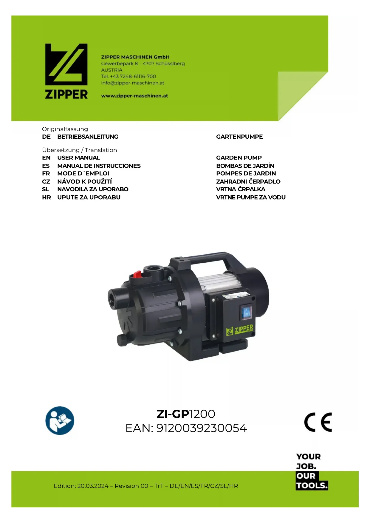 Téléchargez la notice de votre Pompe à eau au format PDF gratuitement ! Retrouvez votre notice ZI-GP1200 - Zipper et reprennez votre appareil électronique en main. Sur cette page sont publiés tous les documents nécessaires à l'utilisation de votre appareil ZI-GP1200 de la marque Zipper.