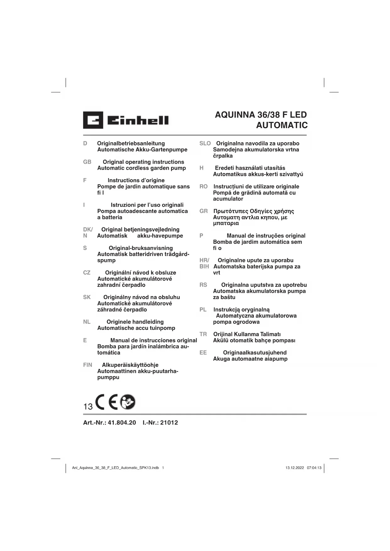 Uniquement pour les pays de l’Union Européenne Ne jetez pas les outils électriques dans les ordures ménagères! Selon la norme européenne 2012/19/CE relative aux appareils électriques et systèmes électroniques usés et selon son application dans le droit national, les outils électriques usés doivent être récoltés à part et apportés à un recyclage respectueux de l’environnement. Possibilité de recyclage en alternative à la demande de renvoi : Le propriétaire de l’appareil électrique est obligé, en guise d’alternative à un envoi en retour, à contribu- er à un recyclage eff ectué dans les règles de l’art en cas de cessation de la propriété. L’ancien appareil peut être remis à un point de collecte dans ce but. Cet organisme devra l’éliminer dans le sens de la Loi sur le cycle des matières et les déchets. Ne sont pas concernés les accessoires et ressources fournies sans composants électroniques. Veuillez noter que lors de la mise au rebut, les accumulateurs et les moyens d’éclairage (par ex. am- poule) sont retirés de l’appareil. Toute réimpression ou autre reproduction de la documentation et des papiers joints aux produits, même sous forme d’extraits, est uniquement permise une fois l’accord explicite de l’Einhell Germany AG obte- nu. Sous réserve de modifi cations techniques Anl_Aquinna_36_38_F_LED_Automatic_SPK13.indb 39Anl_Aquinna_36_38_F_LED_Automatic_SPK13.indb 39 13.12.2022 07:05:1213.12.2022 07:05:12F