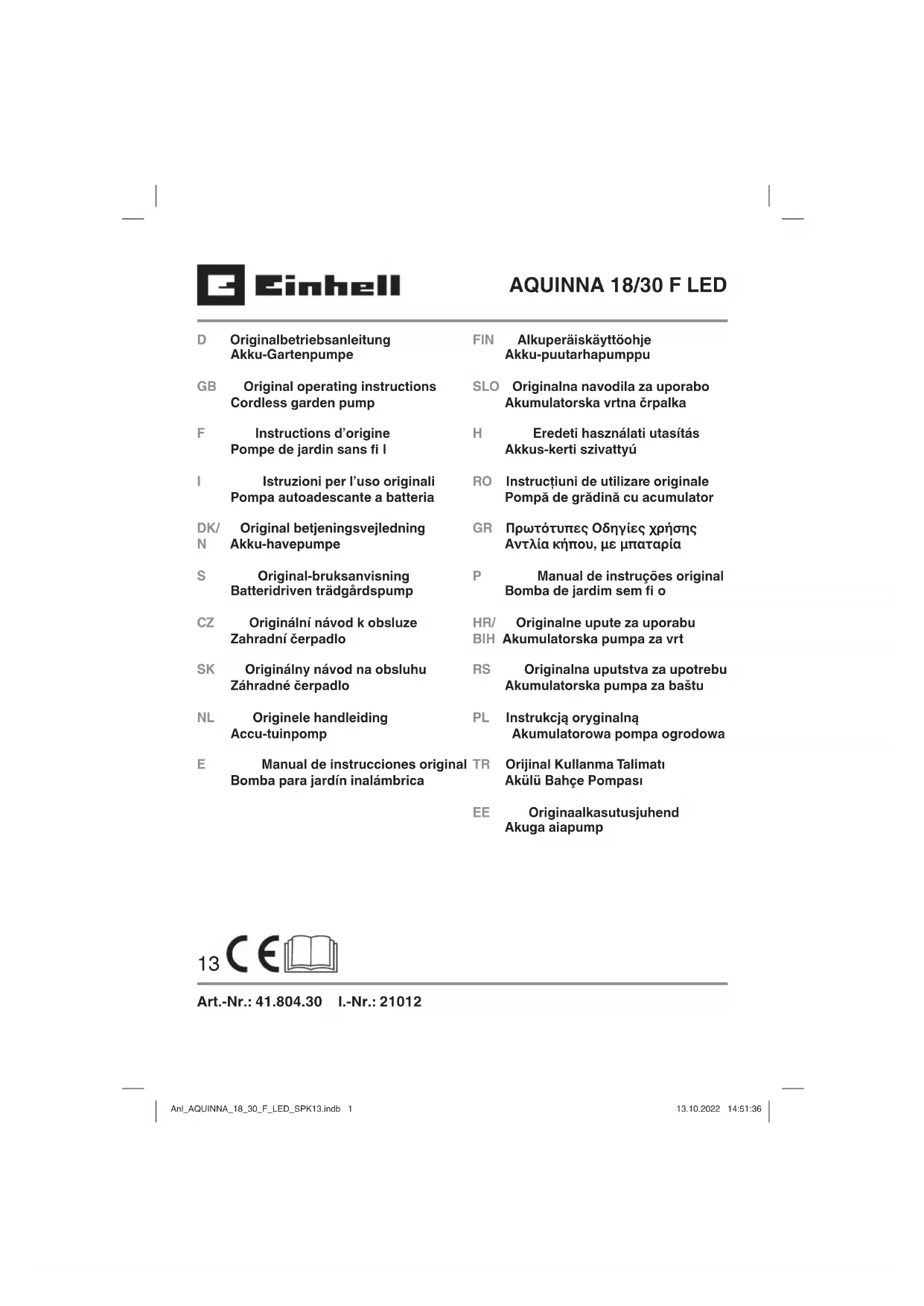 Uniquement pour les pays de l’Union Européenne Ne jetez pas les outils électriques dans les ordures ménagères! Selon la norme européenne 2012/19/CE relative aux appareils électriques et systèmes électroniques usés et selon son application dans le droit national, les outils électriques usés doivent être récoltés à part et apportés à un recyclage respectueux de l’environnement. Possibilité de recyclage en alternative à la demande de renvoi : Le propriétaire de l’appareil électrique est obligé, en guise d’alternative à un envoi en retour, à contribu- er à un recyclage eff ectué dans les règles de l’art en cas de cessation de la propriété. L’ancien appareil peut être remis à un point de collecte dans ce but. Cet organisme devra l’éliminer dans le sens de la Loi sur le cycle des matières et les déchets. Ne sont pas concernés les accessoires et ressources fournies sans composants électroniques. Veuillez noter que lors de la mise au rebut, les accumulateurs et les moyens d’éclairage (par ex. am- poule) sont retirés de l’appareil. Toute réimpression ou autre reproduction de la documentation et des papiers joints aux produits, même sous forme d’extraits, est uniquement permise une fois l’accord explicite de l’Einhell Germany AG obte- nu. Sous réserve de modifi cations techniques Anl_AQUINNA_18_30_F_LED_SPK13.indb 38Anl_AQUINNA_18_30_F_LED_SPK13.indb 38 13.10.2022 14:52:2613.10.2022 14:52:26F