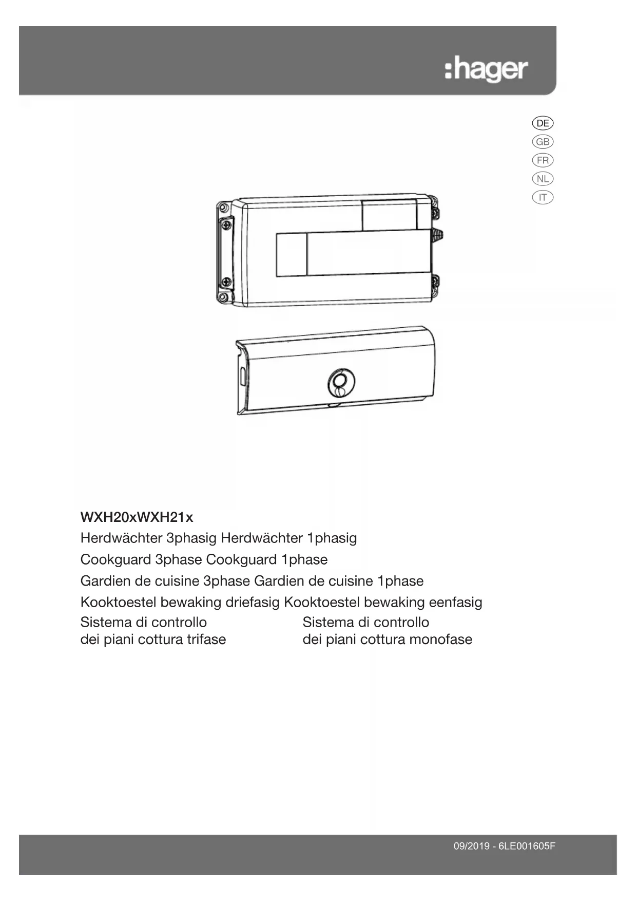 Gardien de cuisine 1phase WXH21x Gardien de cuisine 3phase WXH20x Mode d'emploi et instructions de montage Ce document est uniquement pour les appareils à partir de la date de fa- brication 09/2019 1 Consignes de sécurité L'installation et le montage d'appareils élec- triques doivent être eectués uniquement par un électricien qualié. Les prescriptions de prévention contre les accidents en vigueur dans le pays doivent être respectées. Le non-respect des consignes d'installation peut entraîner des dommages sur l'appareil, un incendie ou présenter d'autres dangers. Risque de choc électrique. Déconnecter tous les disjoncteurs avant l’intervention sur l’appareil. Risque de choc électrique. L'appareil ne peut pas être complètement mis hors ten- sion. La charge n'est pas isolée galvanique- ment du secteur, même lorsque l'appareil est désactivé. L'appareil convient uniquement pour un usage dans des domiciles privés et ne convient pas pour un usage dans des cui- sines industrielles ou pour des cuisinières / plans de cuisson destinés aux cuisines in- dustrielles. L'appareil est uniquement destiné à des cui- sinières / plans de cuisson à alimentation électrique. L'appareil n'est pas destiné à allumer et éteindre la cuisinière / le plan de cuisson. L'appareil ne coupe l'alimentation électrique qu'en cas d'alarme. L'appareil ne remplace pas les détecteurs de fumées imposés par la loi dans les loge- ments. Procéder à un contrôle de fonctionnement de l'appareil tous les trois mois (voir cha- pitre 5.2 Réalisation de la mise en service et des essais de fonctionnement). Ne jamais procéder à des situations délibé- rément dangereuses sur la cuisinière dans le but de tester l'appareil. Ce mode d'emploi fait partie intégrante du produit et doit être conservée par l'utilisa- teur nal.a