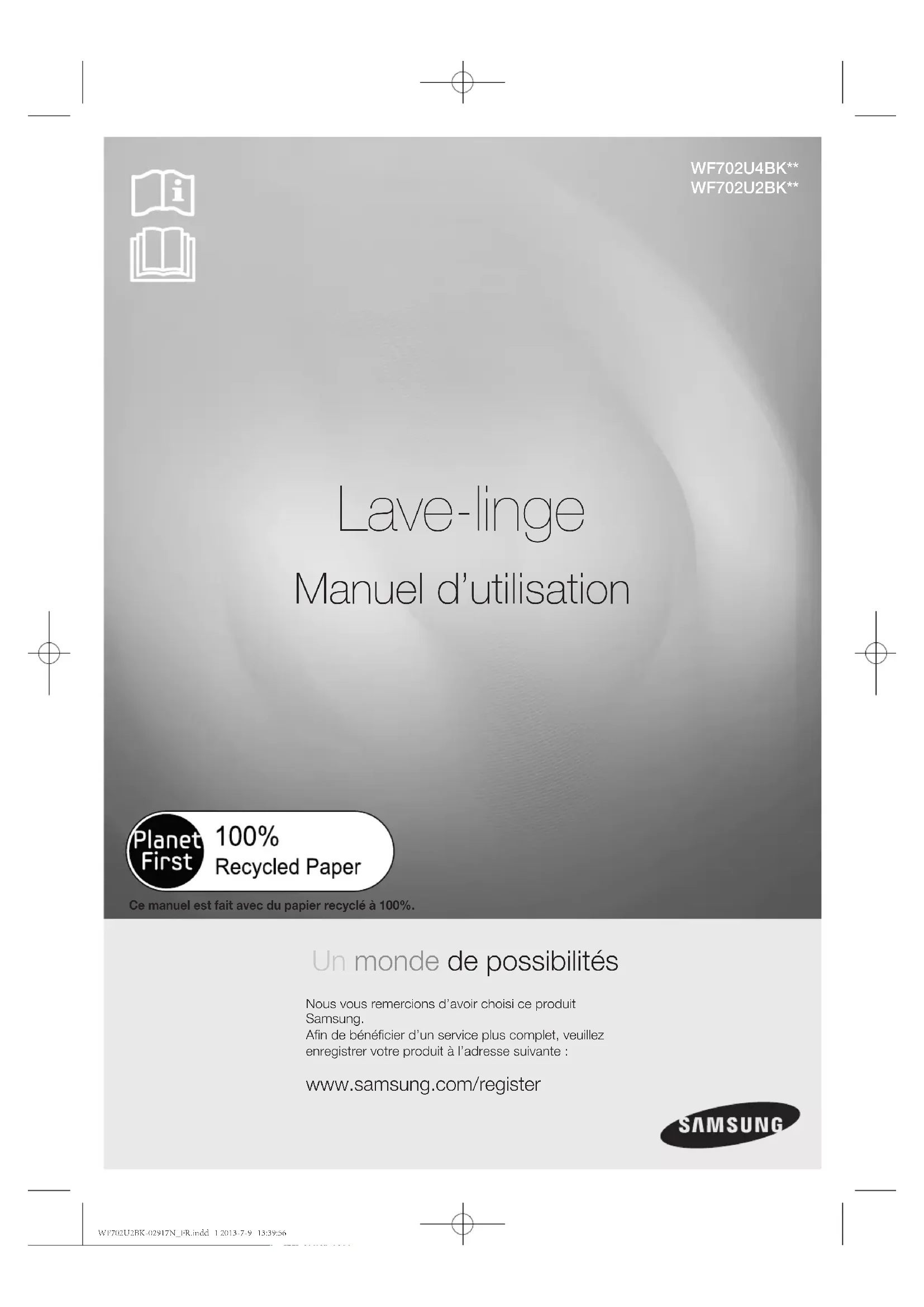 Lave-linge Manuel d’utilisation Un monde de possibilités Nous vous remercions d’avoir choisi ce produit Samsung.Afin de bénéficier d’un service plus complet, veuillez enregistrer votre produit à l’adresse suivante: www.samsung.com/register Ce manuel est fait avec du papier recyclé à 100%. WF702U4BK** WF702U2BK** WF702U2BK-02917N_FR.indd 1 2013-7-9 13:39:562_ Caractéristiques de votre nouveau lave-linge Samsung Caractéristiques de votre nouveau lave-linge Samsung Avec ce nouveau lave-linge, faire une lessive prend un tout autre sens. Capacité XXL, économies d’énergie...Le lave-linge Samsung possède toutes les caractéristiques nécessaires pour transformer une tâche désagréable en un vrai moment de plaisir.