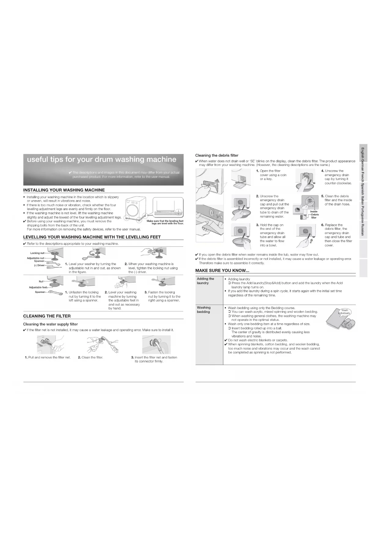 - Lavez un seul article de literie à la fois, quelle que soit sa taille. ➲ Placez le linge roulé en boule dans le tambour. Le centre de gravité est ainsi mieux réparti, réduisant les vibrations et le bruit. ✔ Ne lavez jamais decouverture chauffante en machine. ✔ Lors de l’essorage des couvertures et du linge de lit en coton ou en lainage, il est possible que les vibrations et le bruit soient excessifs et empêchent le cycle de se terminer car l’essorage ne peut être effectué. Ecrou de blocage Ecrou de réglage Clé Tournevis plat Ecrou Pieds réglables Clé Intérieur du filtre à impuretés Laver séparément Vérifiez que le lave-linge est de niveau English German French Spanish Italian Portuguese RussianESSAYEZ LA SOLUTION SUIVANTE... Le hublot ne s’ouvre pas Le hublot ne peut être ouvert lorsque la température à l’intérieur de la machine est élevée ou lorsque le tambour est rempli d’eau.