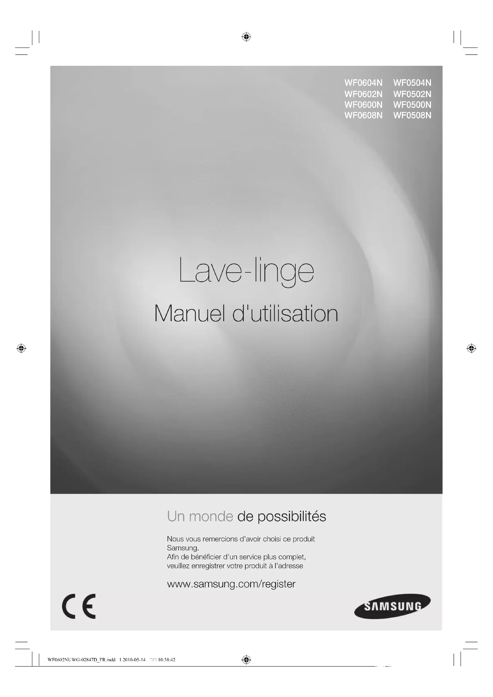 Lave-linge Manuel d'utilisation Un monde de possibilités Nous vous remercions d'avoir choisi ce produit Samsung.Afin de bénéficier d'un service plus complet, veuillez enregistrer votre produit à l’adresse www.samsung.com/register WF0604N WF0602N WF0600N WF0608N WF0504N WF0502N WF0500N WF0508N WF0602NUWG-02847D_FR.indd 1 2010-05-14 10:38:422_ caractéristiques de votre nouveau lave-linge Samsung caractéristiques de votre nouveau lave-linge Samsung Avec ce nouveau lave-linge, faire une lessive prend un tout autre sens. Capacité XXL, économie d'énergie... Le lave-linge Samsung possède toutes les caractéristiques nécessaires pour transformer une tâche désagréable en un vrai moment de plaisir.