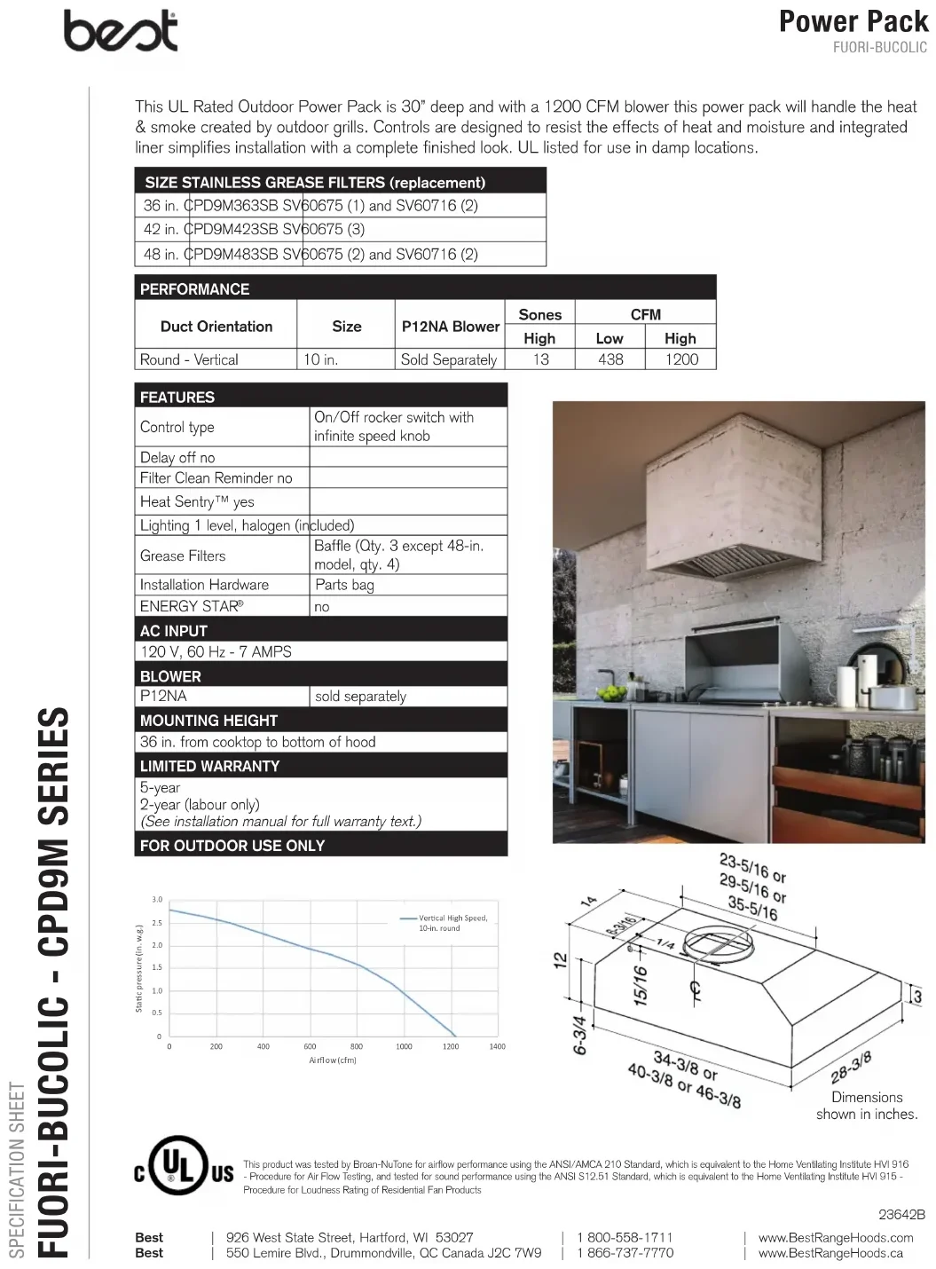 Hotte encastrable FUORI-BUCOLIC Best | 926 West State Street, Hartford, WI 53027 | 1 800 558-1711 | www.BestRangeHoods.com Best | 550 boul. Lemire, Drummondville, QC Canada J2C 7W9 | 1 866 737-7770 | www.BestRangeHoods.ca Les débits d’air de cet appareil ont été testés par Broan-NuTone selon la norme ANSI/AMCA 210, qui est équivalente à la norme HVI 916 - Procedure for Air Flow Testing [Procédure de test des débits d’air] et les niveaux sonores ont été testés selon la norme ANSI S12.51, qui est équivalente à la norme HVI 915 - Procedure for Loudness Rating of Residential Fan Products [Procédure de test du niveau sonore des appareils de ventilation résidentielle]. Cette hotte encastrable, homologuée pour une utilisation à l’extérieur par UL, a une profondeur de 30 po. La puissance de son ventilateur de 1200 pi³/min évacuera la chaleur et la fumée engendrées par la cuisson sur gril extérieur. Ses commandes sont conçues pour résister aux effets de la chaleur et de l’humidité et son revêtement intégré en simplifie l’installation tout en donnant une finition impeccable. Homologuée par UL pour usage dans des environnements humides. Les dimensions indiquées sont en pouces. CARACTÉRISTIQUES Type de commande Interrupteur à bascule Marche/Arrêt et bouton rotatif à vitesse variable Arrêt différé non Rappel d’entretien des filtres non Détecteur Heat Sentry