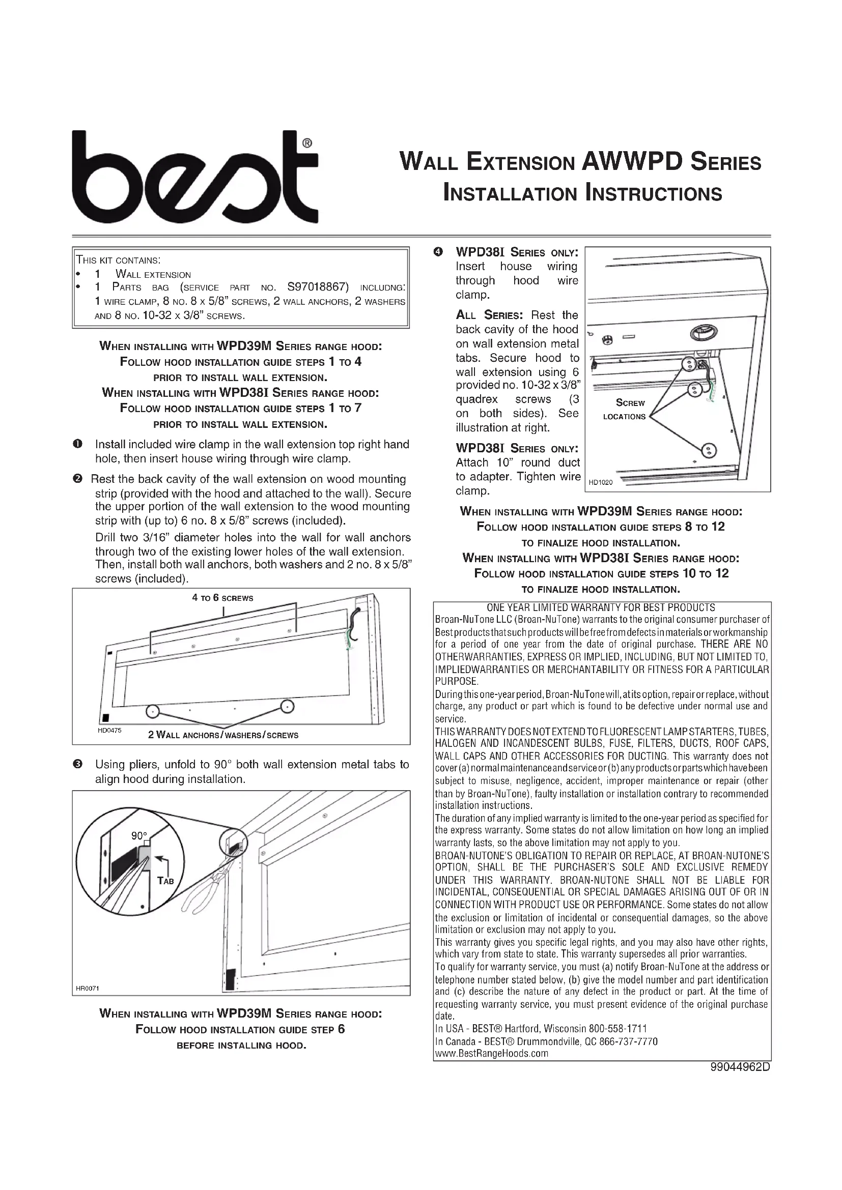 SEULEMENT : Relier un conduit rond de 10 po à l’adaptateur. Serrer le serre-fils. LORS D’UNE INSTALLATION AVEC UNE HOTTE DE SÉRIE WPD39M : SUIVRE LES ÉTAPES 8 À 12 DU GUIDE D’INSTALLATION DE LA HOTTE POUR TERMINER SON INSTALLATION. LORS D’UNE INSTALLATION AVEC UNE HOTTE DE SÉRIE WPD38I : SUIVRE LES ÉTAPES 10 À 12 DU GUIDE D’INSTALLATION DE LA HOTTE POUR TERMINER SON INSTALLATION. HD1020 EMPLACEMENT DES VIS GARANTIE LIMITÉE DE UN AN POUR LES PRODUITS BEST Broan-NuTone LLC (Broan-NuTone) garantit à l’acheteur consommateur original de produits Best qu’ils sont exempts de vice de matériaux ou de fabrication pour une période de un an à compter de la date d’achat original. IL N’Y A PAS D’AUTRES GARANTIES, EXPRIMÉES OU IMPLICITES, INCLUANT MAIS NON LIMITÉES AUX GARANTIES IMPLICITES DE QUALITÉ MARCHANDE ET DE CONVENANCE DANS UN BUT PARTICULIER. Durant cette période de un an,Broan-NuTone, à sa discrétion, réparera ou remplacera gratuitement tout produit ou pièce qui s’avèrera défectueux et ayant été utilisé normalement et d’une manière non abusive. CETTE GARANTIE NE S’APPLIQUE PAS AUX TUBES FLUORESCENTS ET AUX DÉMARREURS, NI AUX AMPOULES HALOGÈNES OU INCANDESCENTES, FUSIBLES, FILTRES, CONDUITS, CAPUCHONS DE TOIT, CAPUCHONS MURAUX ET AUTRES ACCESSOIRES POUR CONDUITS. Cette garantie ne couvre pas (a) l’entretien et le service normal ou (b) tout produit ou pièce endommagé à la suite d’un mauvais usage, d’une négligence, d’un accident, d’un entretien inadéquat ou d’une réparation (autre que par Broan-NuTone), d’une mauvaise installation ou d’une installation non conforme au mode d’installation recommandé. La durée de toute garantie implicite est limitée à une période de un an tel que spécifié pour la garantie exprimée. Certains États ou provinces ne permettent pas de limitation de la durée d’une garantie implicite. Cette condition ne s’applique donc peut-être pas dans votre cas. L’ENGAGEMENT DE BROAN-NUTONE À RÉPARER OU À REMPLACER, AU CHOIX DE BROAN-NUTONE, SERA LA SEULE OBLIGATION EXCLUSIVE SOUS CETTE GARANTIE. BROAN-NUTONE NE SE TIENDRA PAS RESPONSABLE DES DOMMAGES DIRECTS, INDIRECTS OU SPÉCIAUX AYANT UN LIEN DIRECT OU INDIRECT AVEC L’UTILISATION OU LA PERFORMANCE DE SES PRODUITS. Certains États ou provinces ne permettent pas l’exclusion ou la limitation de dommages directs ou indirects. Cette condition ne s’applique donc peut-être pas dans votre cas. Cette garantie vous donne des droits spécifiques et il se peut que vous ayez d’autres droits qui varient d’une province à l’autre ou d’un État à l’autre. Cette garantie annule toutes les garanties précédentes. Pour le service sous garantie, vous devez (a) aviser Broan-NuTone à l’adresse ou numéro de téléphone mentionné ci-dessous, (b) donner le numéro de modèle et l’identification de la pièce et (c) décrire la nature de tout défaut dans le produit ou la pièce. Au moment de la demande de service sous garantie, vous devez présenter une preuve de la date d’achat original du produit en question. Aux É.-U. - BEST® Hartford,Wisconsin 800 558-1711 Au Canada - BEST® Drummondville,QC 866 737-7770 www.BestRangeHoods.com HR0071 90° LANGUETTEINSTRUCCIONES PARA LA INSTALACIÓN DE LA