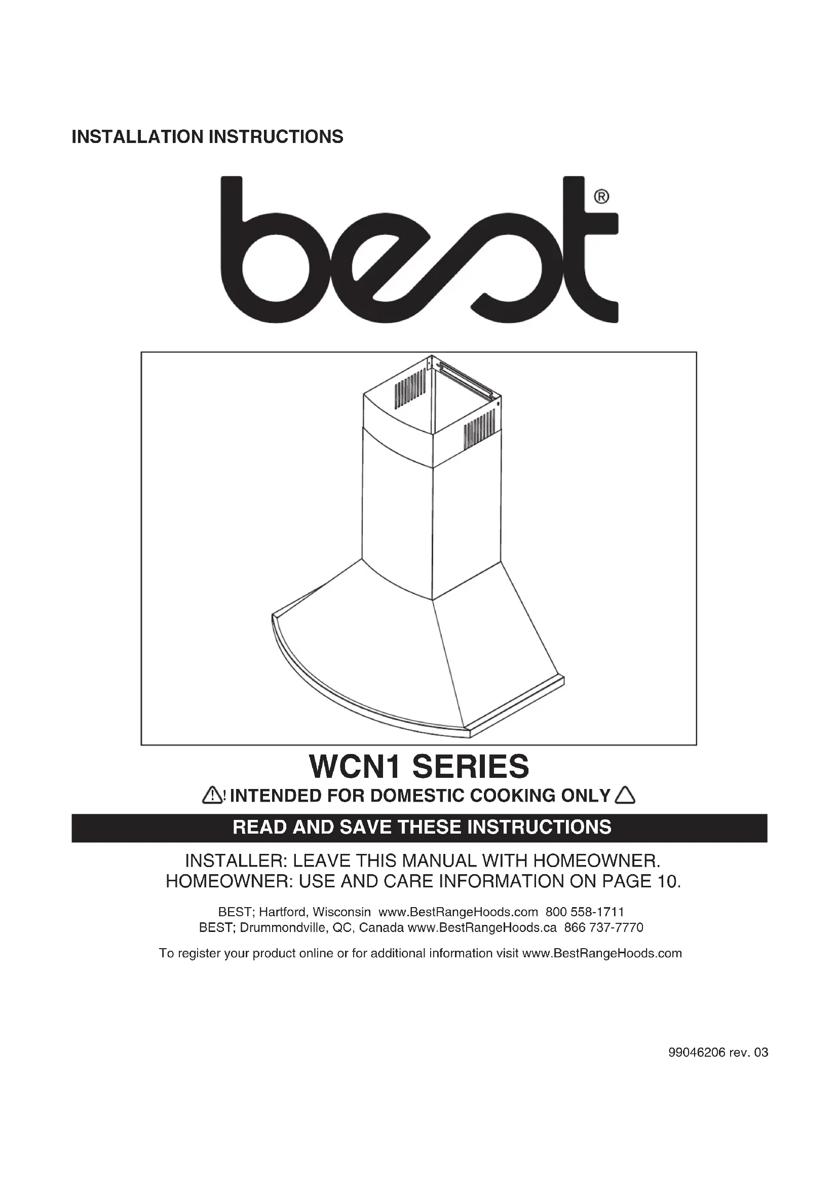 GUIDE D'INSTALLATION BEST; Hartford, Wisconsin www.BestRangeHoods.com 800 558-1711BEST; Drummondville, QC, Canada www.BestRangeHoods.ca 866 737-7770 Pour enregistrer votre produit en ligne ou pour obtenir plus d'information, consultez notre site www.BestRangeHoods.com
