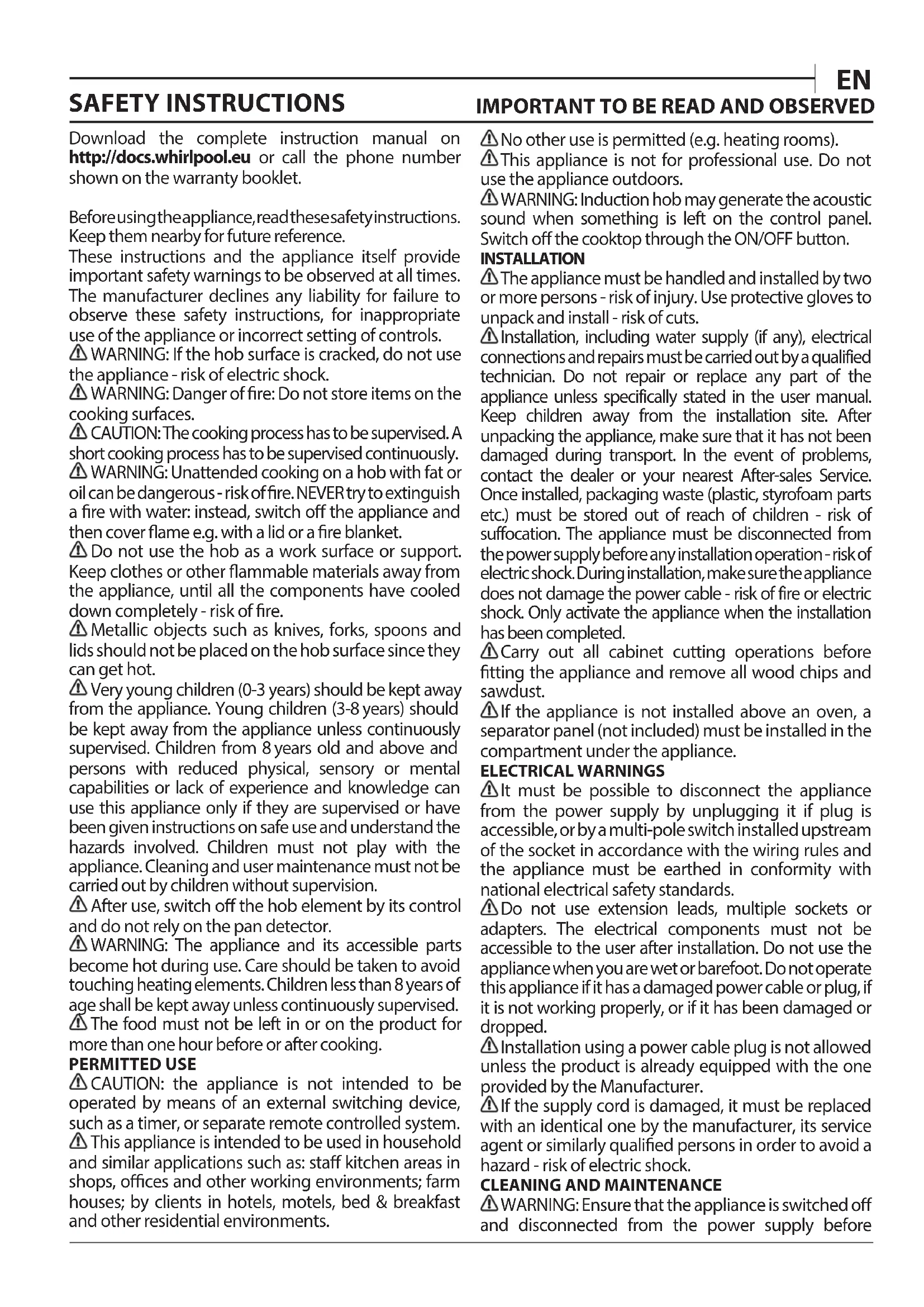 Télécharger le manuel d'instructions complet sur http://docs.whirlpool.eu ou appeler le numéro de téléphone indiqué sur le livret de garantie. Avant d’utiliser l’appareil, lire attentivement les consignes de sécurité. Conservez-les à portée pour consultation ultérieure. Le présent manuel et l'appareil en question contiennent des consignes de sécurité importantes qui doivent être observées en tout temps. Le Fabricant décline toute responsabilité si les consignes de sécurité ne sont pas respectées, en cas de mauvaise utilisation de l’appareil, ou d'un mauvais réglage des commandes.