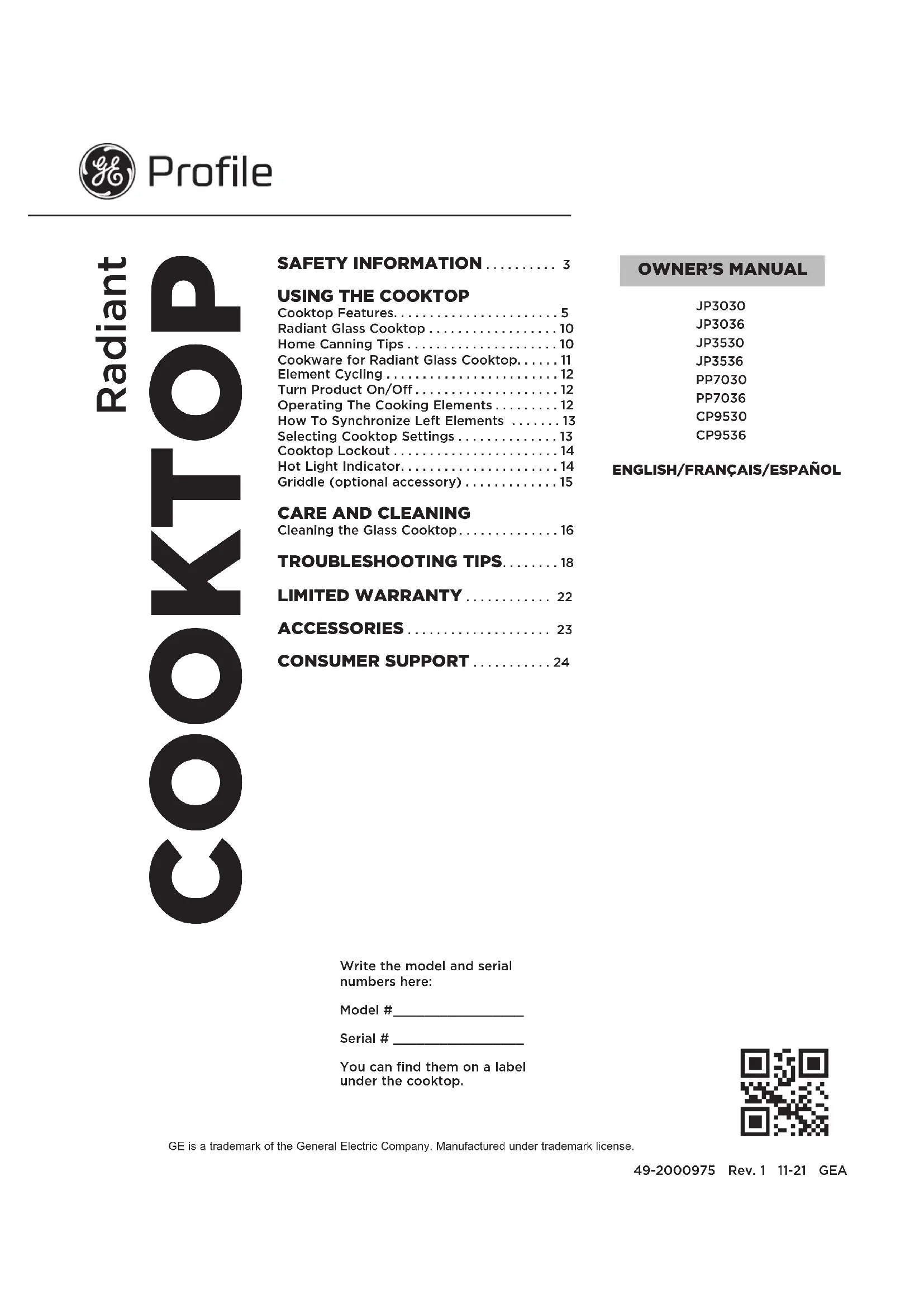 ACCESSOIRES .................... 23 SOUTIEN AU CONSOMMATEUR ................24 GE est une marque déposée de General Electric Company. Fabriqué sous licence de marque. MANUEL DU PROPRIÉTAIRE JP3030 JP3036 JP3530 JP3536 PP7030 PP7036 CP9530 CP95362 49-2000975 Rev. 1 NOUS VOUS REMERCIONS D’ACCUEILLIR GE APPLIANCES CHEZ VOUS Que vous ayez grandi avec GE Appliances ou qu’il s’agisse de votre première acquisition, nous sommes heureux de vous accueillir dans notre famille. Nous sommes fiers du savoir-faire, de l’innovation et de l’esthétique qui composent chaque appareil GE Appliances, et nous pensons que vous le serez aussi. Dans cette optique, nous vous rappelons que l’enregistrement de votre électroménager vous assure la communication de renseignements importants sur le produit et la garantie lorsque vous en avez besoin. Enregistrez votre électroménager GE en ligne dès maintenant. Des sites Web et des numéros de téléphone utiles figurent dans la section Soutien au consommateur de ce manuel d’utilisation. Vous pouvez aussi poster la fiche de garantie pré-imprimée incluse dans l’emballage.49-2000975 Rev. 1 3