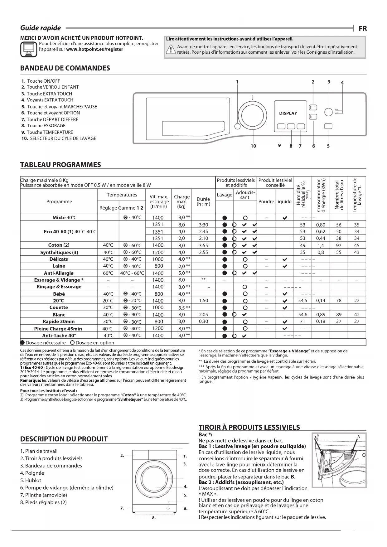 Guide rapide MERCI D’AVOIR ACHETÉ UN PRODUIT HOTPOINT. Pour bénécier d’une assistance plus complète, enregistrer l’appareil sur www.hotpoint.eu/register