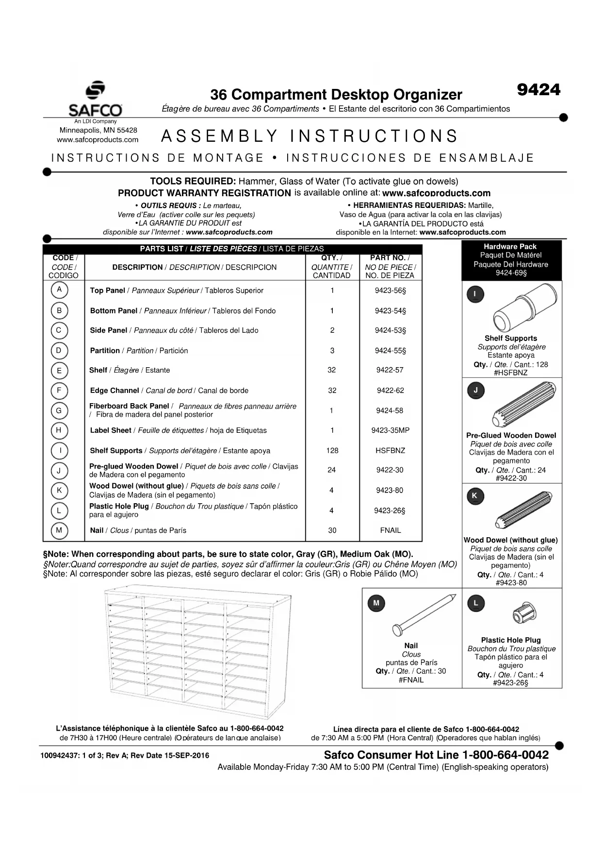 - OUTILS REQUIS : Le marteau, Verre d’Eau (activer colle sur les pequets) •LA GARANTIE DU PRODUIT est disponible sur l’Internet : www.safcoproducts.com