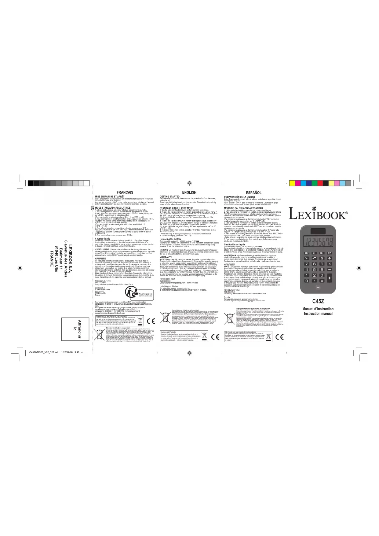 1. Utilisez les touches de calcul pour effectuer les opérations courantes.2. Pour sauvegarder en positif un montant afché, appuyez sur la touche « M+ ». Pour faire vos calculs, entrez le nombre ou le calcul désiré puis appuyez sur « MRC » pour rappeler la mémoire positive.(Ex: 4 est ajouté à la mémoire positive « M+ » : 10 x « MRC » = 40).3. Pour sauvegarder en négatif un montant afché, appuyez sur la touche « M- ». Pour faire vos calculs, entrez le nombre ou le calcul désiré puis appuyez sur « MRC » pour rappeler la mémoire négative.(Ex: 4 est ajouté à la mémoire négative « M- » donc en réalité - 4 : 10 x« MRC » = - 40).4. Pour afcher le montant enregistré en mémoire, appuyez sur « MRC ». Appuyez une deuxième fois sur « MRC » pour effacer le contenu de la mémoire.- Appuyez sur la touche √ pour calculer et afcher la racine carrée du dernier nombre entré.5. Pour remettre tout à zéro, appuyez sur « ON/C ». Changer la pile La calculatrice fonctionne avec 1 pile de type AG10 - 1.5V . Pour changer la pile, utilisez un tournevis pour ouvrir le compartiment situé au dos de la calculatrice. Insérez une pile AG10 neuve en vous assurant que le signe + soit sur le dessus. Refermez la porte du compartiment des piles.AVERTISSEMENT : D’importantes interférences électromagnétiques ou des décharges électrostatiques peuvent provoquer un dysfonctionnement ou une perte de données. Si l’appareil ne fonctionne pas correctement, réinitialisez l’unité en appuyant sur le bouton RESET ou enlevez puis remettez les piles. GARANTIE Ce produit est couvert par notre garantie de deux ans. Pour toute mise en œuvre de la garantie ou de service après-vente, vous devez vous adresser à votre revendeur muni de votre preuve d’achat. Notre garantie couvre les vices de matériel ou de montage imputables au constructeur à l’exclusion de toute détérioration provenant du non-respect de la notice d’utilisation ou de toute intervention intempestive sur l’article (telle que démontage, exposition à la chaleur ou à l’humidité…). Les piles ne sont pas garanties. Note : Veuillez garder ce mode d’emploi, il contient d’importantes informations. Le contenu de ce mode d’emploi peut changer sans préavis. Aucune partie de ce mode d’emploi ne doit être reproduite sans le consentement écrit du fabricant. RÉFÉRENCE : C45Z©LEXIBOOK®Conçu et développé en Europe – Fabriqué en ChineLexibook S.A6 avenue des AndesBatiment 1191940 Les UlisFrancePour vos demandes concernant un problème SAV ou une réclamation,composez le 01 84 88 58 59 ou écrivez à supporttechnique@support.lexibook. com. Pour toutes vos autres demandes (conseil d’achat, choix d’un produit,renseignement avant-vente sur l’utilisation d’un produit …),composez le 08 92 23 27 26 (0,34€ TTC /minute) ou écrivez àsupporttechnique@support.lexibook.com. C45Z Manuel d’instruction Instruction manual Informations sur la protection de l’environnementTout appareil électrique usé est une matière recyclable et ne devrait pas faire partie des ordures ménagères! Nous vous demandons de bien vouloir nous soutenir en contribuant activement au ménagement des ressources et à la protection de l’environnement en déposant cet appareil dans des sites de collecte (si existants). ESPAÑOL
