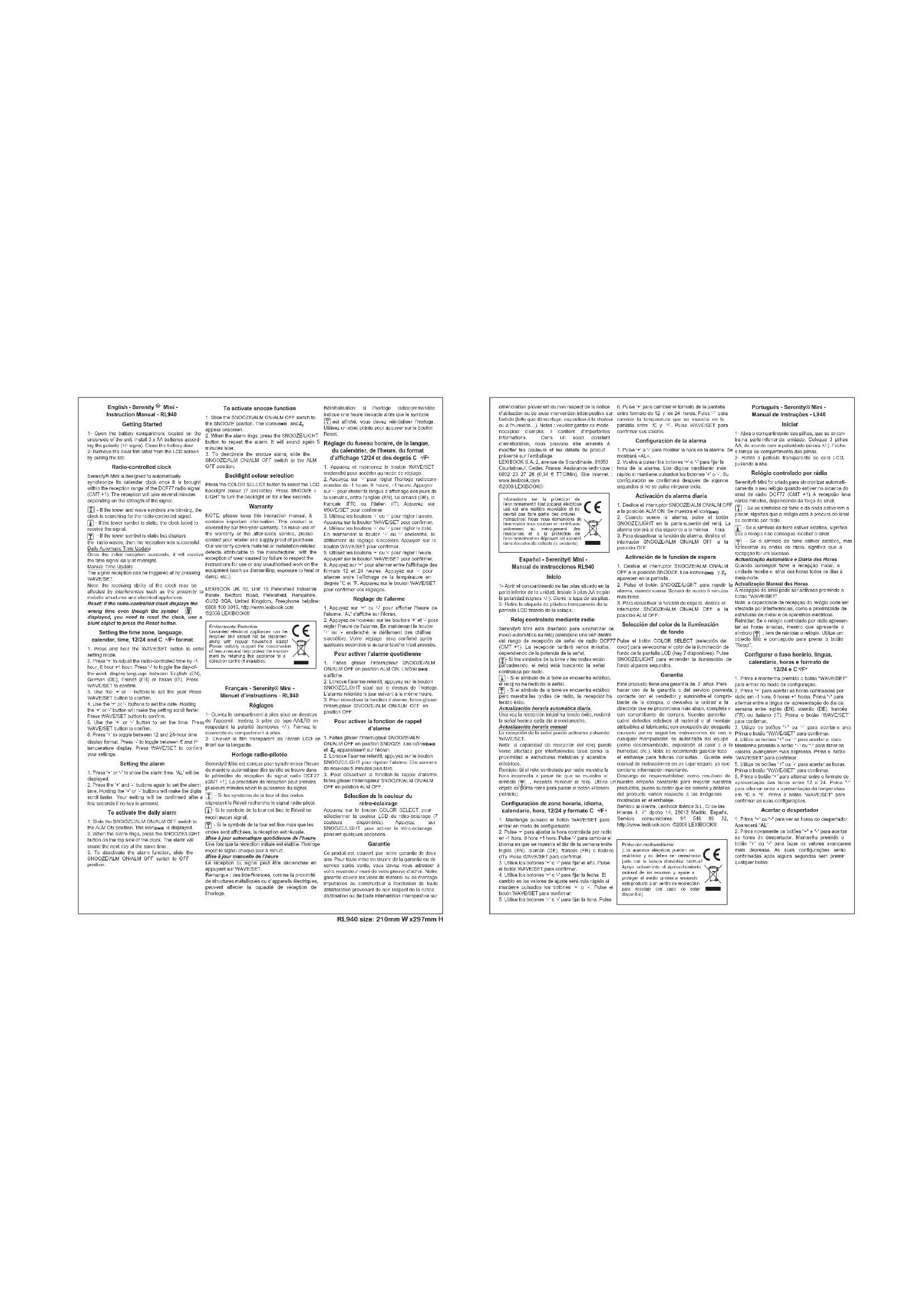faites glisser l’interrupteur SNOOZE/ALM ON/ALM OFF en position ALM OFF. Sélection de la couleur du rétro-éclairage Appuyez sur le bouton COLOR SELECT pour sélectionner la couleur LCD du rétro-éclairage (7 couleurs disponibles). Appuyez sur SNOOZE/LIGHT pour activer le rétro-éclairage pendant quelques secondes. Garantie Ce produit est couvert par notre garantie de deux ans. Pour toute mise en œuvre de la garantie ou de service après vente, vous devez vous adresser à votre revendeur muni de votre preuve d'achat. Notre garantie couvre les vices de matériel ou de montage imputables au constructeur à l'exclusion de toute détérioration provenant du non respect de la notice d'utilisation ou de toute intervention intempestive sur détérioration provenant du non respect de la notice d'utilisation ou de toute intervention intempestive sur l'article (telle que démontage, exposition à la chaleur ou à l'humidité…). Notes : veuillez garder ce mode nocapicel d’emploi, il contient d’importantes informations. Dans un souci constant d’amélioration, nous pouvons être amenés à modifier les couleurs et les détails du produit présenté sur l’emballage. LEXIBOOK S.A, 2, avenue de Scandinavie, 91953 Courtaboeuf, Cedex, France. Assistance technique : 0892 23 27 26 (0,34 € TTC/Min), Site Internet : www.lexibook.com ©2006 LEXIBOOK® Español - Serenity® Mini - Manual de instrucciones RL940 Inicio