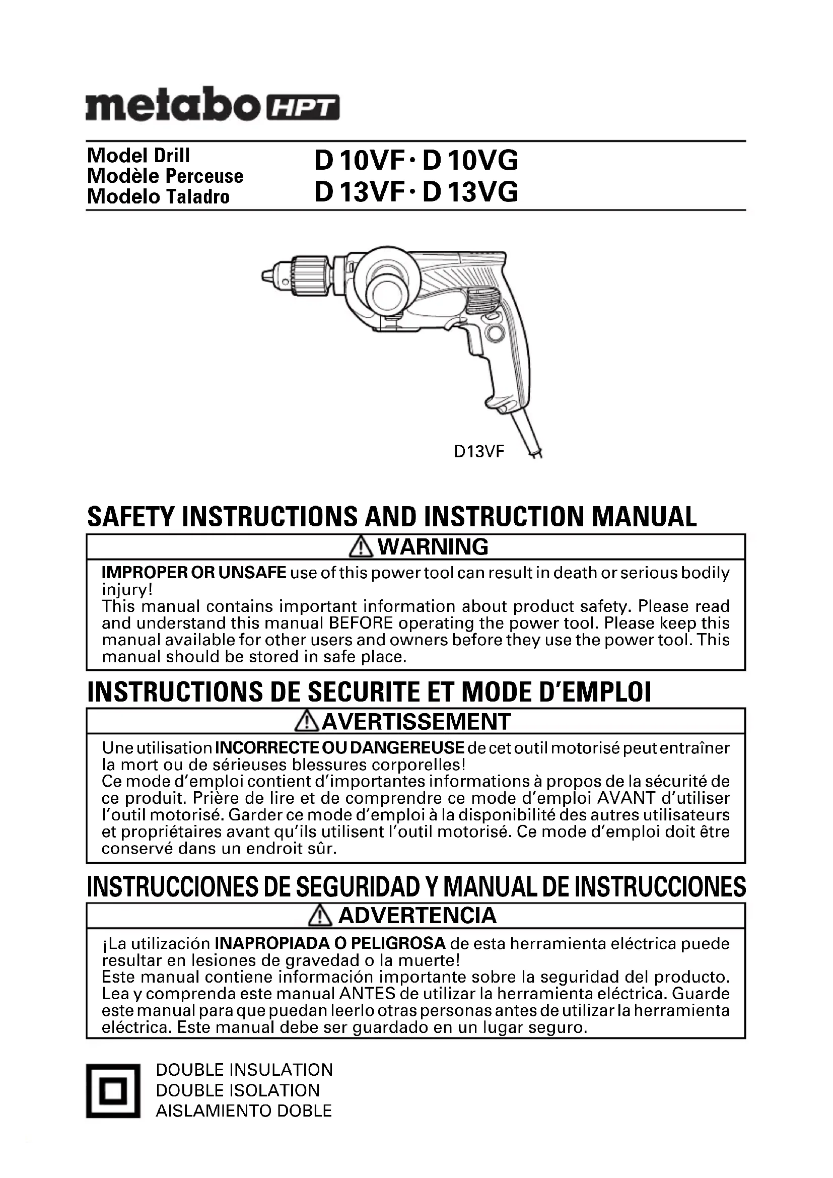 13VG Model Drill Modèle Perceuse Modelo Taladro DOUBLE INSULATION DOUBLE ISOLATION AISLAMIENTO DOBLE INSTRUCTIONS DE SECURITE ET MODE D’EMPLOI AVERTISSEMENT Une utilisation INCORRECTE OU DANGEREUSE de cet outil motorisé peut entraîner la mort ou de sérieuses blessures corporelles! Ce mode d’emploi contient d’importantes informations à propos de la sécurité de ce produit. Prière de lire et de comprendre ce mode d’emploi AVANT d’utiliser l’outil motorisé. Garder ce mode d’emploi à la disponibilité des autres utilisateurs et propriétaires avant qu’ils utilisent l’outil motorisé. Ce mode d’emploi doit être conservé dans un endroit sûr.